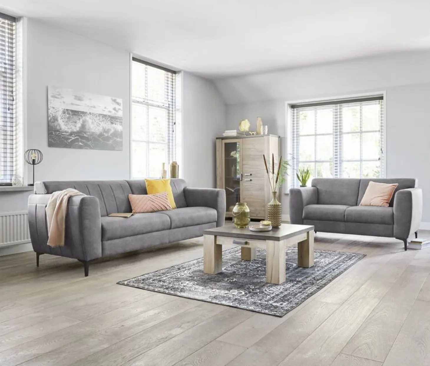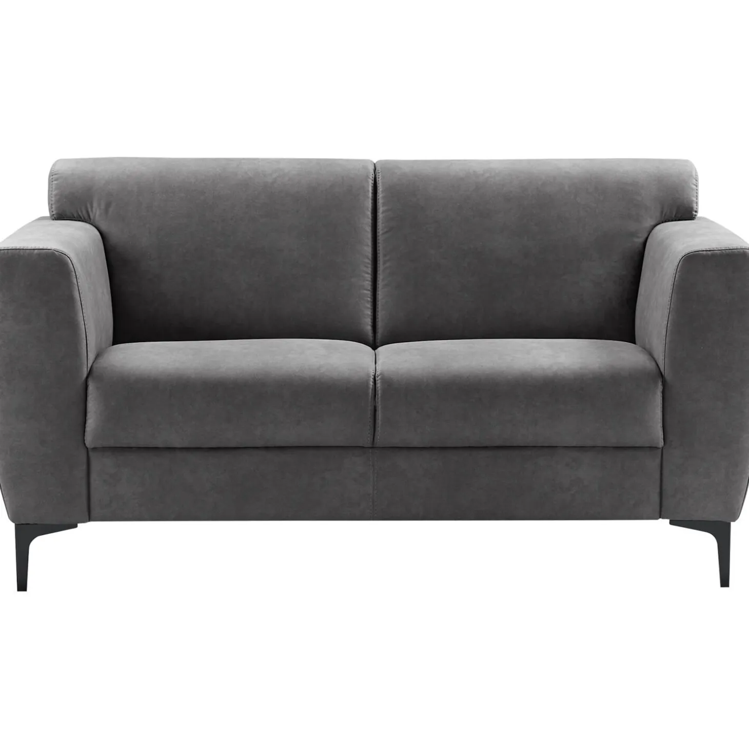 De bank is uitgevoerd in een donkergrijze microvezelstof. Deze stof met luxe uitstraling is opgebouwd uit synthetische vezels, waardoor deze erg sterk is. Desondanks voelt hij erg zacht aan. Bovendien is de stof makkelijk in onderhoud, en erg geschikt voor intensief gebruik. De zwarte metalen poten voegen een vleugje elegantie en duurzaamheid toe aan het geheel.