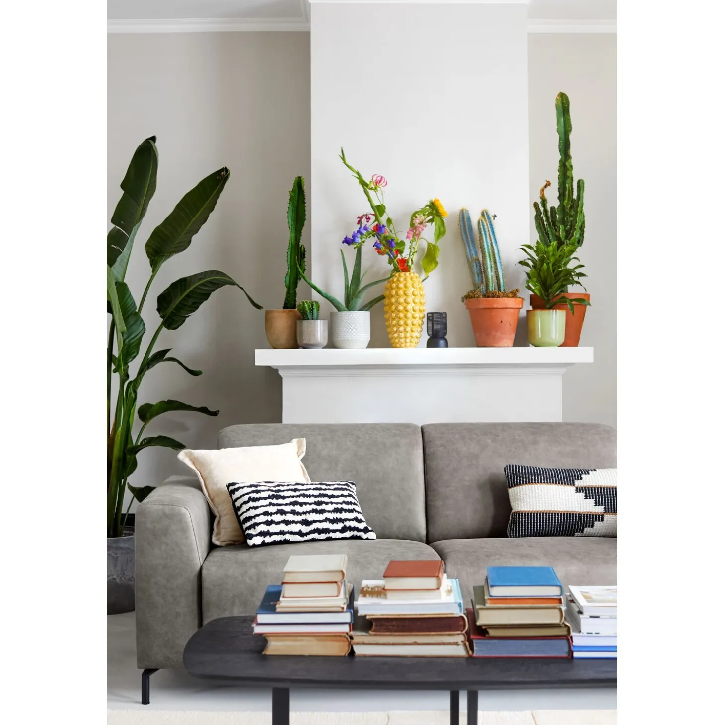 2,5 zitsbank Aveiro is bekleed met een grijze stof die het uiterlijk en gevoel heeft van echt leer. Deze sterke stof geeft de bank een natuurlijke uitstraling. Aveiro heeft aan de binnenkant afgeronde armleuningen voor een mooi speels effect. In de winkel is de bank verkrijgbaar met 3 verschillende armbreedtes om je gewenste leuning te creëren. De bank staat op zwart metalen poten voor een moderne uitstraling.