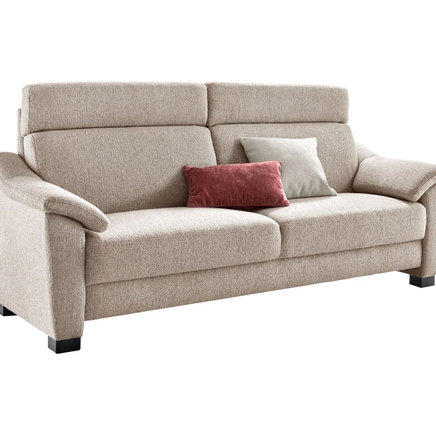 | Uitvoering | Uitgevoerd in stof taurus 05-beige met arm E, extra hoge rug, pocketvering met een toplaag van traagschuim in de zitting, polyetherschuim in de rug en zwarte houten poten, type HF2 (hoogte 5,5 cm). |