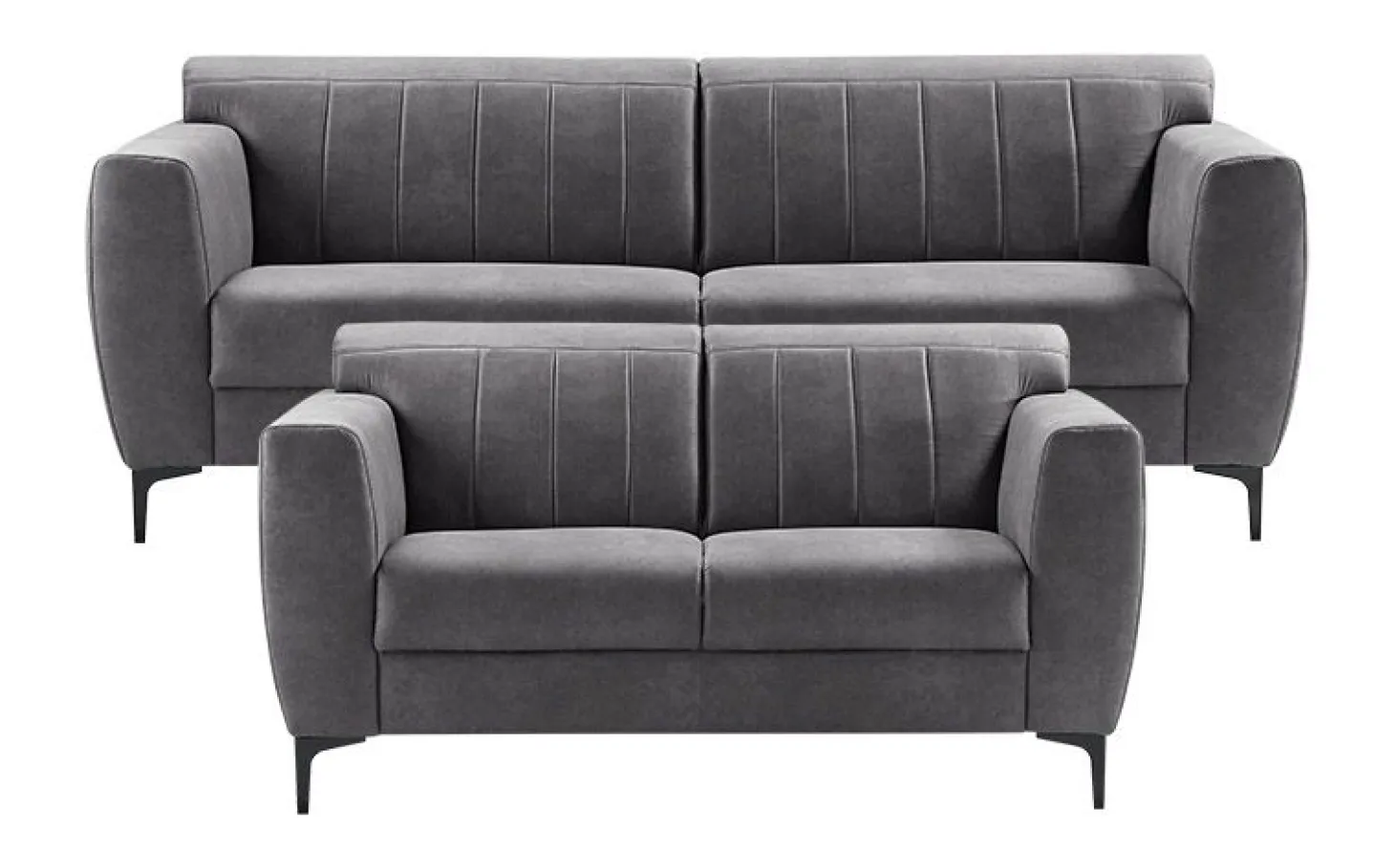 De banken zijn uitgevoerd in een donkergrijze microvezelstof. Deze stof met luxe uitstraling is opgebouwd uit synthetische vezels, waardoor deze erg sterk is. Desondanks voelt hij erg zacht aan. Bovendien is de stof makkelijk in onderhoud, en erg geschikt voor intensief gebruik. De zwarte metalen poten voegen een vleugje elegantie en duurzaamheid toe aan het geheel.