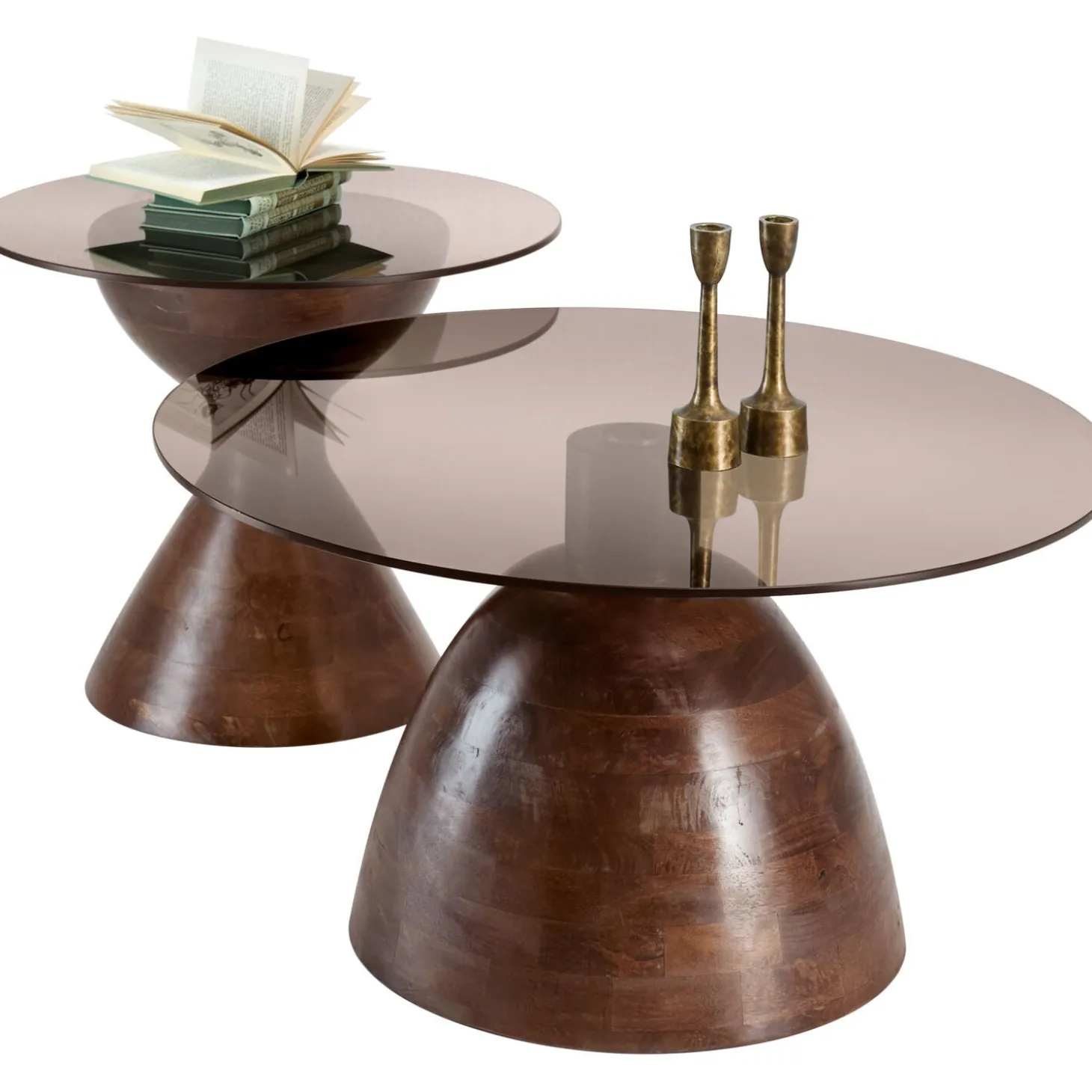 Handige bijzettafel die makkelijk te verplaatsen en overal inzetbaar is. Uitgevoerd met een smoked glas bovenblad en een massief mango houten onderstel in kleur bruin walnoot. Ook leverbaar als salontafel met afmeting Ø78 cm. Combineer de verschillende tafeltjes voor een leuk geheel.