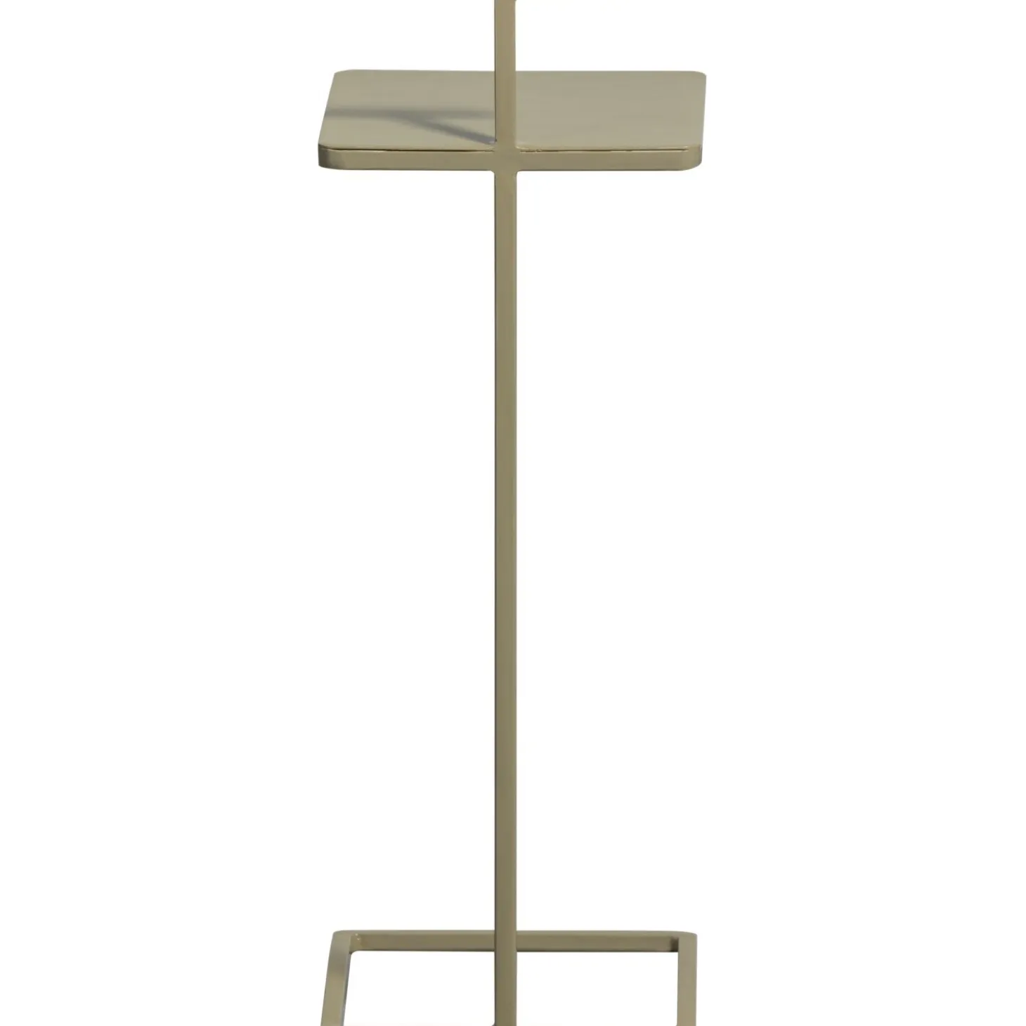 Deze bijzettafel heeft een vierkant tafelblad van 22 cm breed en een strak metalen frame in dezelfde zandkleur, waardoor het een mooi en harmonieus geheel vormt. De hoogte van 64 cm maakt de tafel perfect om naast een fauteuil of bank te plaatsen, bijvoorbeeld voor een kopje koffie, boek of decoratie.