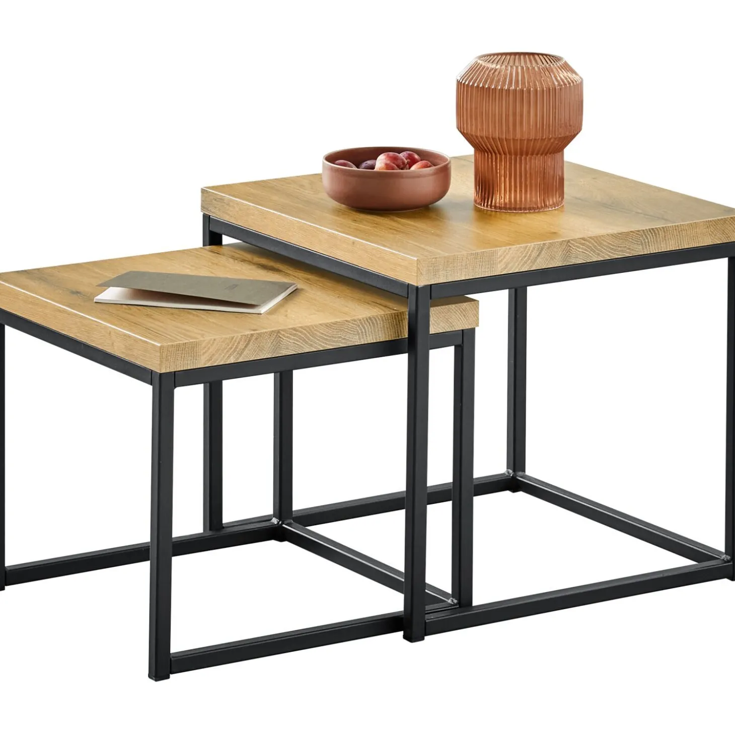 Deze set van twee vierkante bijzettafels is niet alleen stijlvol maar ook praktisch in gebruik. De tafels verschillen subtiel in formaat, 50 cm en 44 cm breed, waardoor je ze elegant onder elkaar kunt schuiven. Het strakke zwarte metalen frame vormt een mooi contrast met het warme old teak blad. Samen creëren ze een stoere maar toch tijdloze uitstraling die in vrijwel ieder interieur past. Gebruik ze als set naast de bank, los van elkaar in de ruimte of schuif ze compact in elkaar wanneer je wat extra plek nodig hebt.