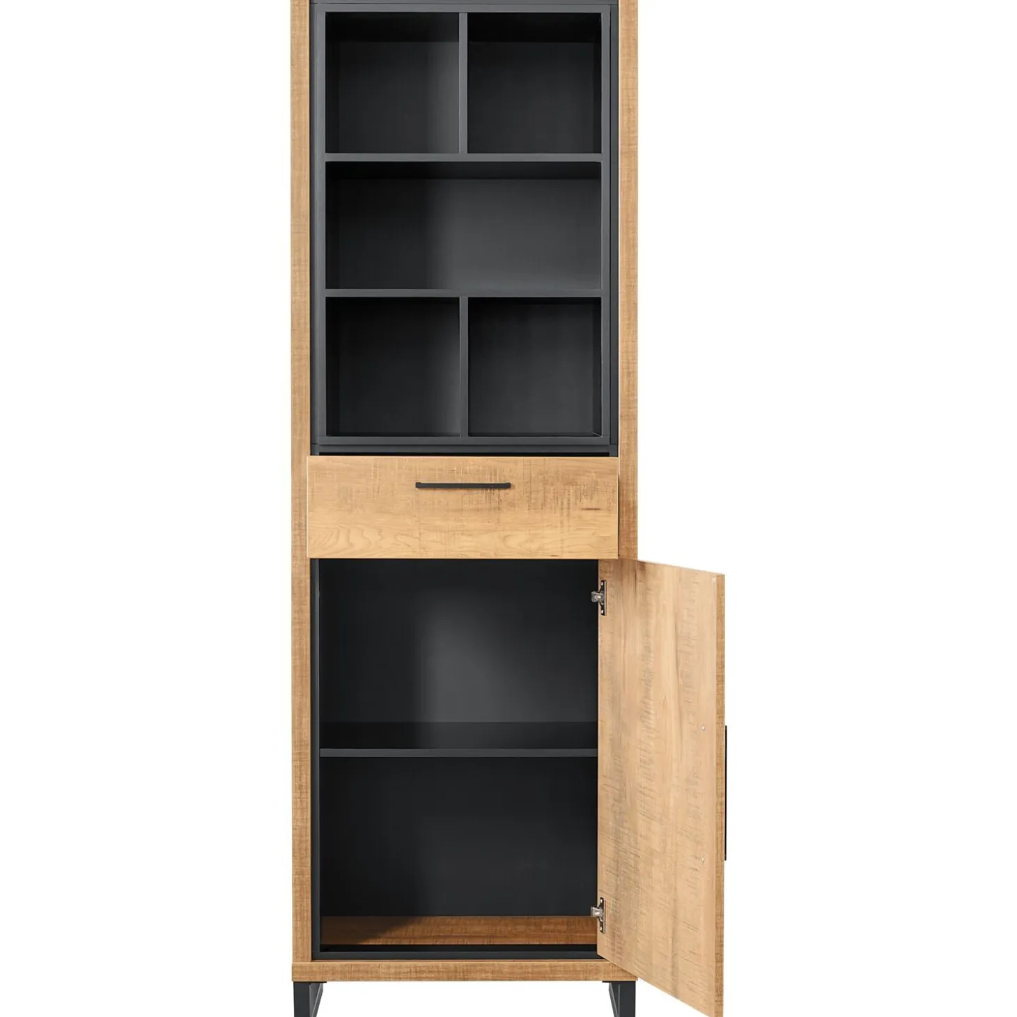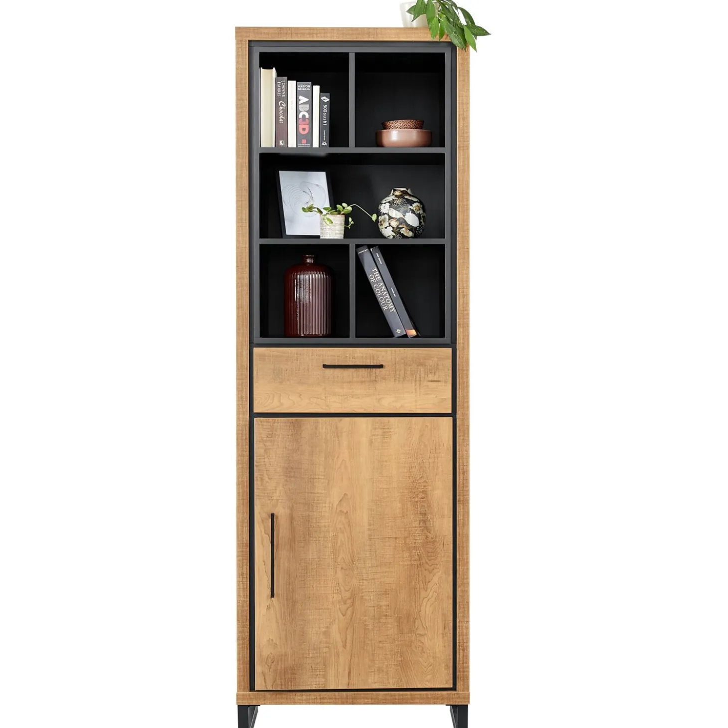 | Uitvoering | Uitgevoerd in melamine mango decor met zwart metalen frame met 1 deur, 1 lade en 5 open vakken. |