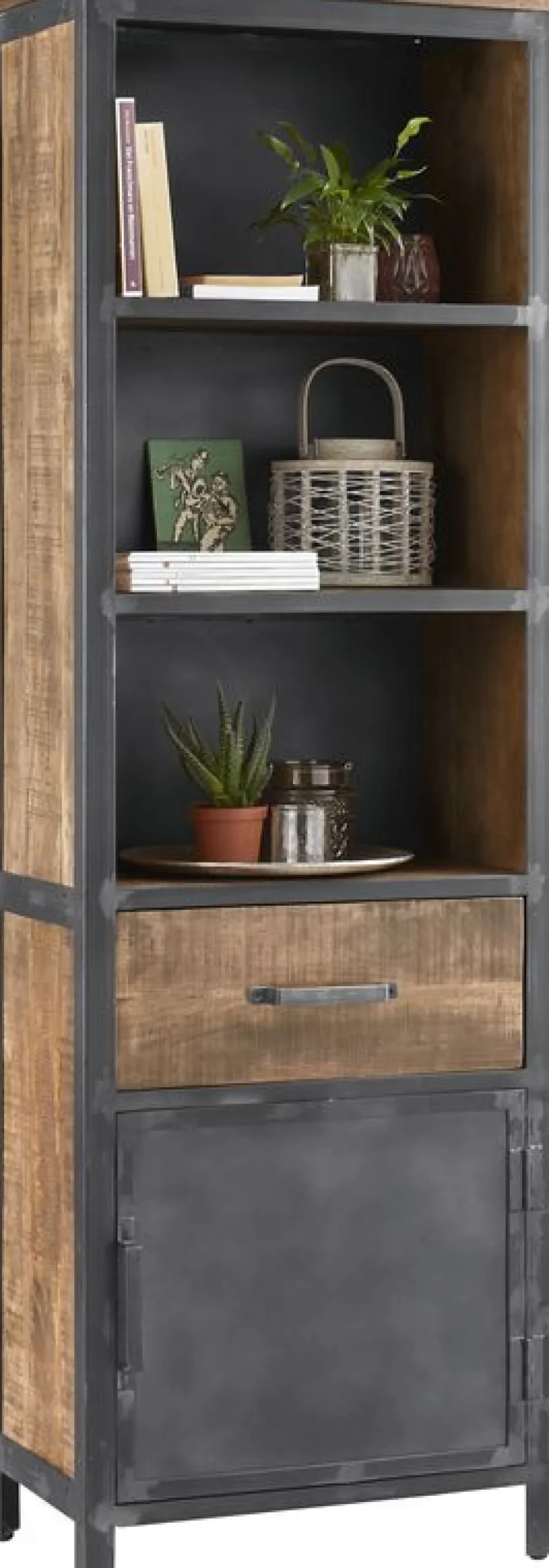 Deze boekenkast Indusy heeft een deur, een lade en 3 open vakken. De afmetingen van de open vakken zijn H33xB55xD35cm. Achter de deur vind je een legplank. Door inwerking van buitenaf kan de kleur na enige tijd lichtjes wijzigen. De kleur kan lichter of donkerder worden. Deze boekenkast is afgewerkt met een transparante lak om een optimale bescherming te garanderen.
