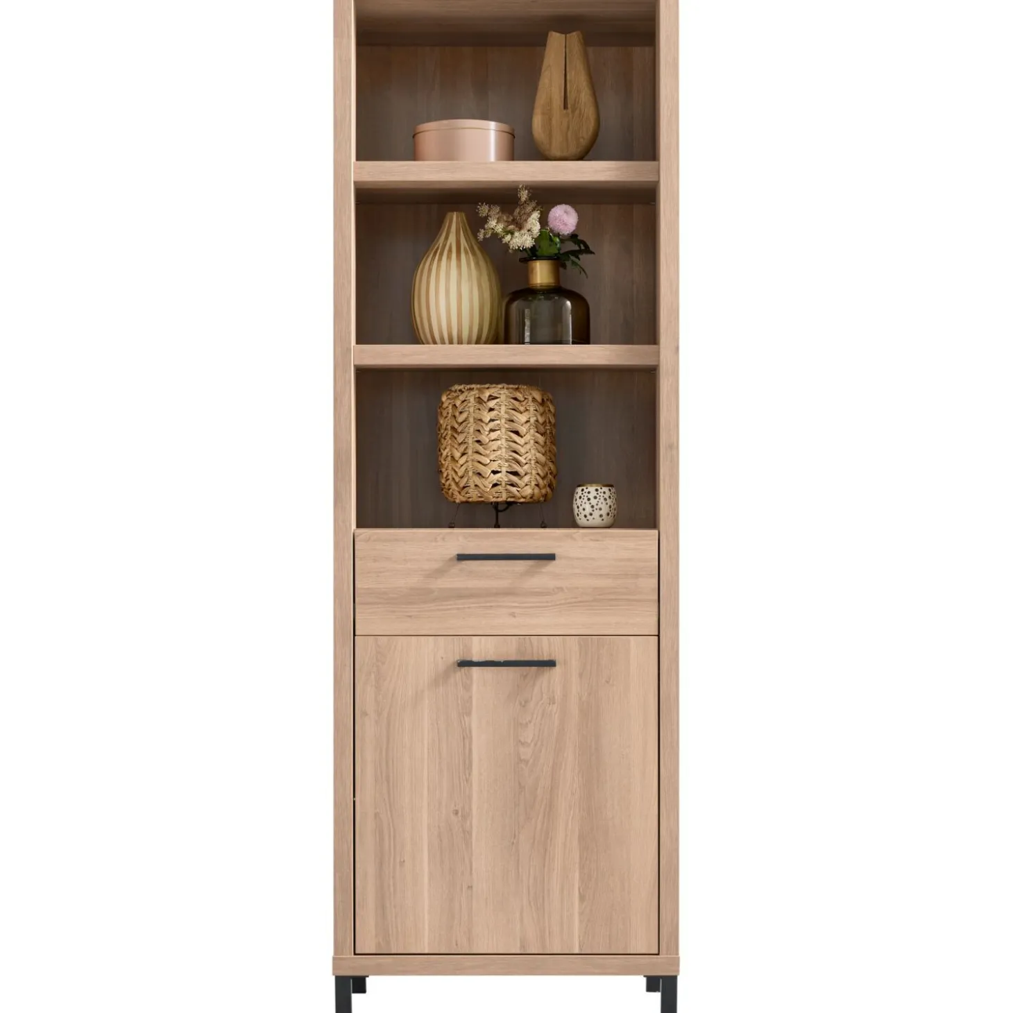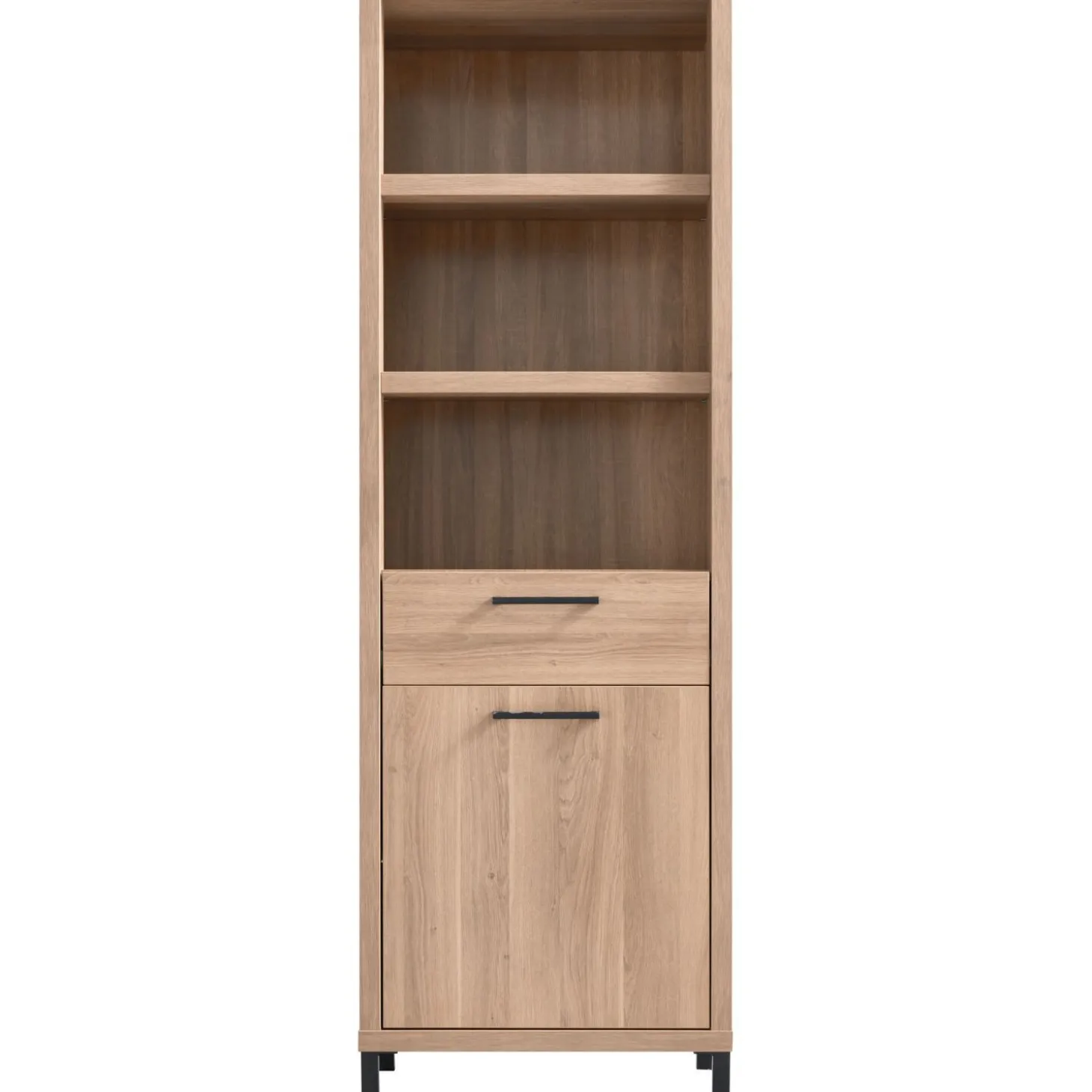 Optimaliseer jouw ruimte met de smalle boekenkast, compleet met softclose technologie voor een geruisloze sluiting. De doordachte indeling omvat een deur, 1 lade en 3 open vakken, met handige legplanken achter de deur. Dit maakt deze boekenkast niet alleen stijlvol, maar ook functioneel.