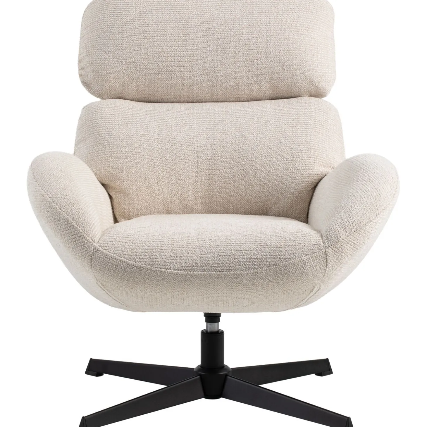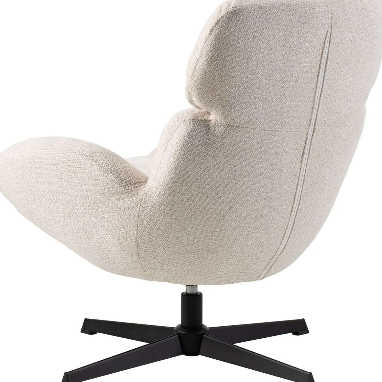 | Uitvoering | Uitgevoerd in stof milan 103-cream met polyetherschuim in de zitting en rug en een zwarte metalen draaipoot. |