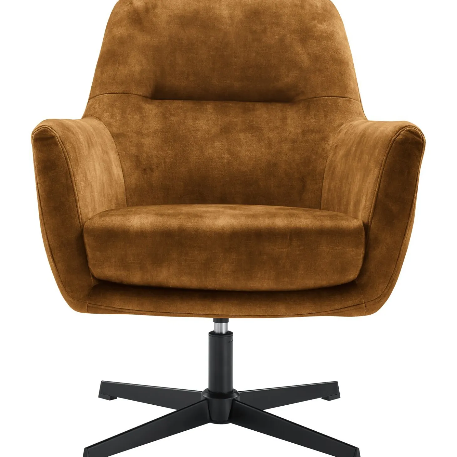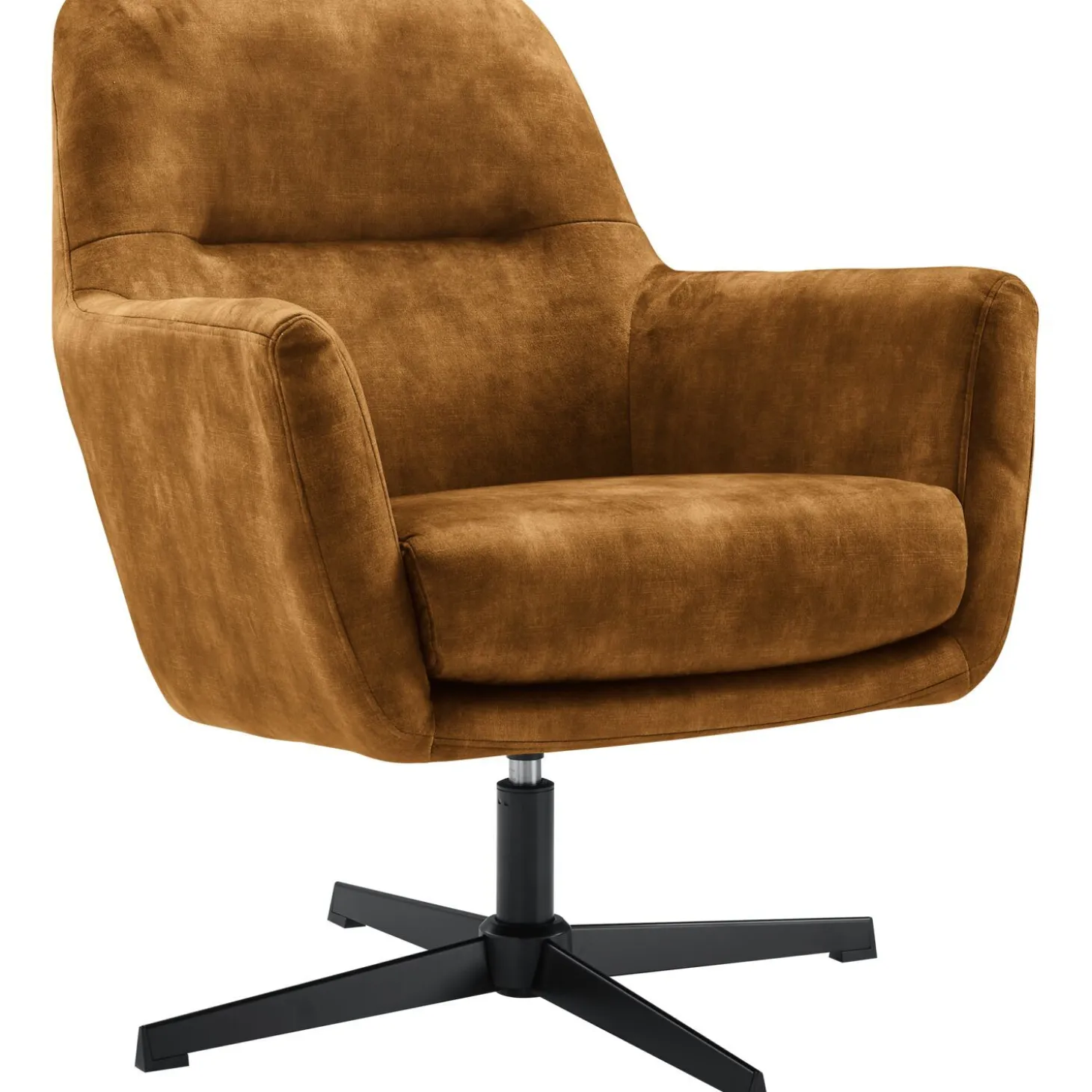 | Uitvoering | Uitgevoerd in stof adore 28-cognac met polyetherschuim in de zitting, polyetherschuim in de rug en een zwart metalen draaipoot. |