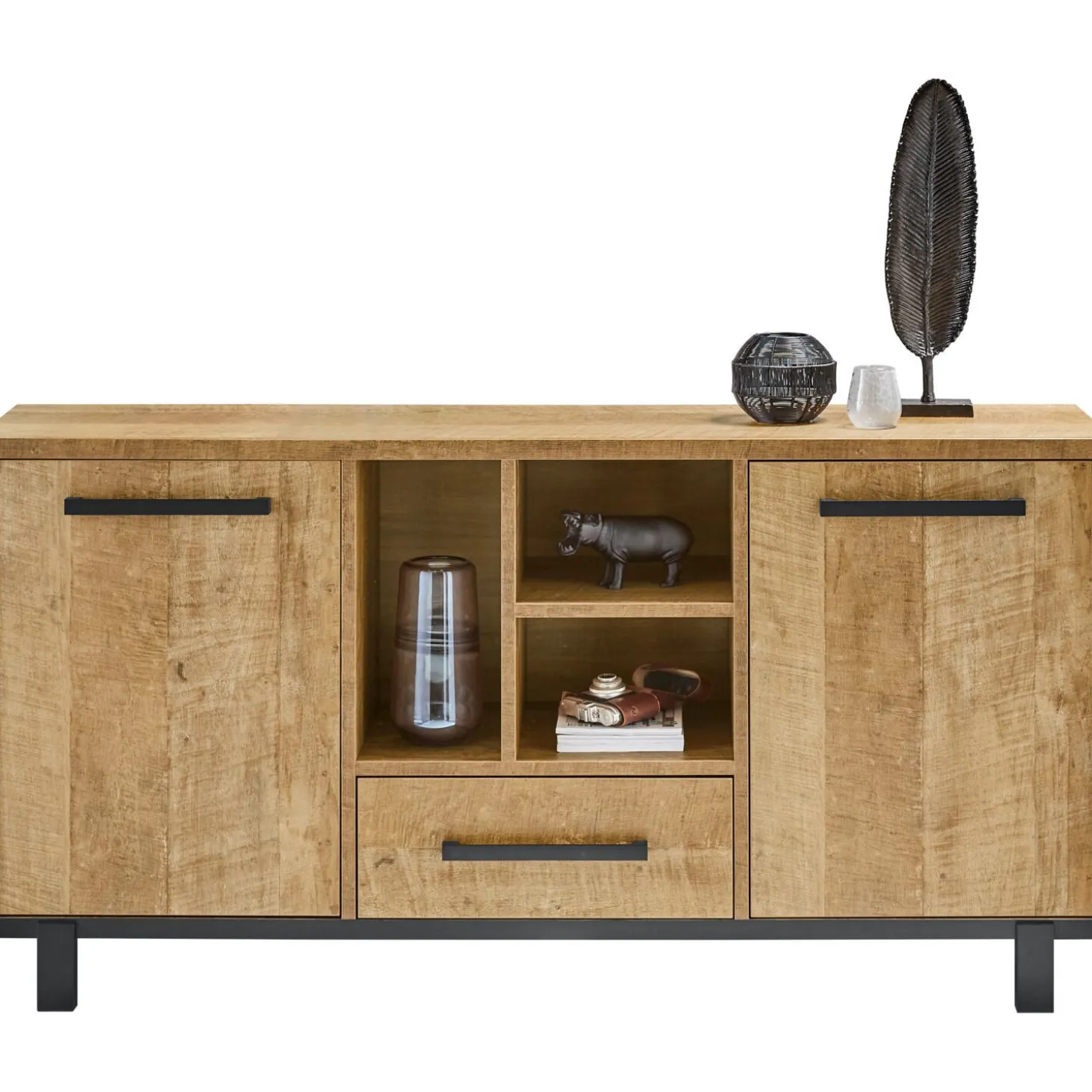 Modern dressoir met een strak uiterlijk. De mooie kleur old teak en het gepoedercoate zwart metalen frame geven je interieur een unieke sfeer.
