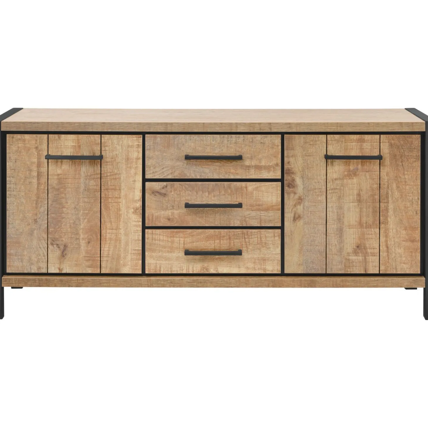 | Uitvoering | Uitgevoerd in de kleur mango met zwart metalen frame, 2 deuren en 3 laden. |