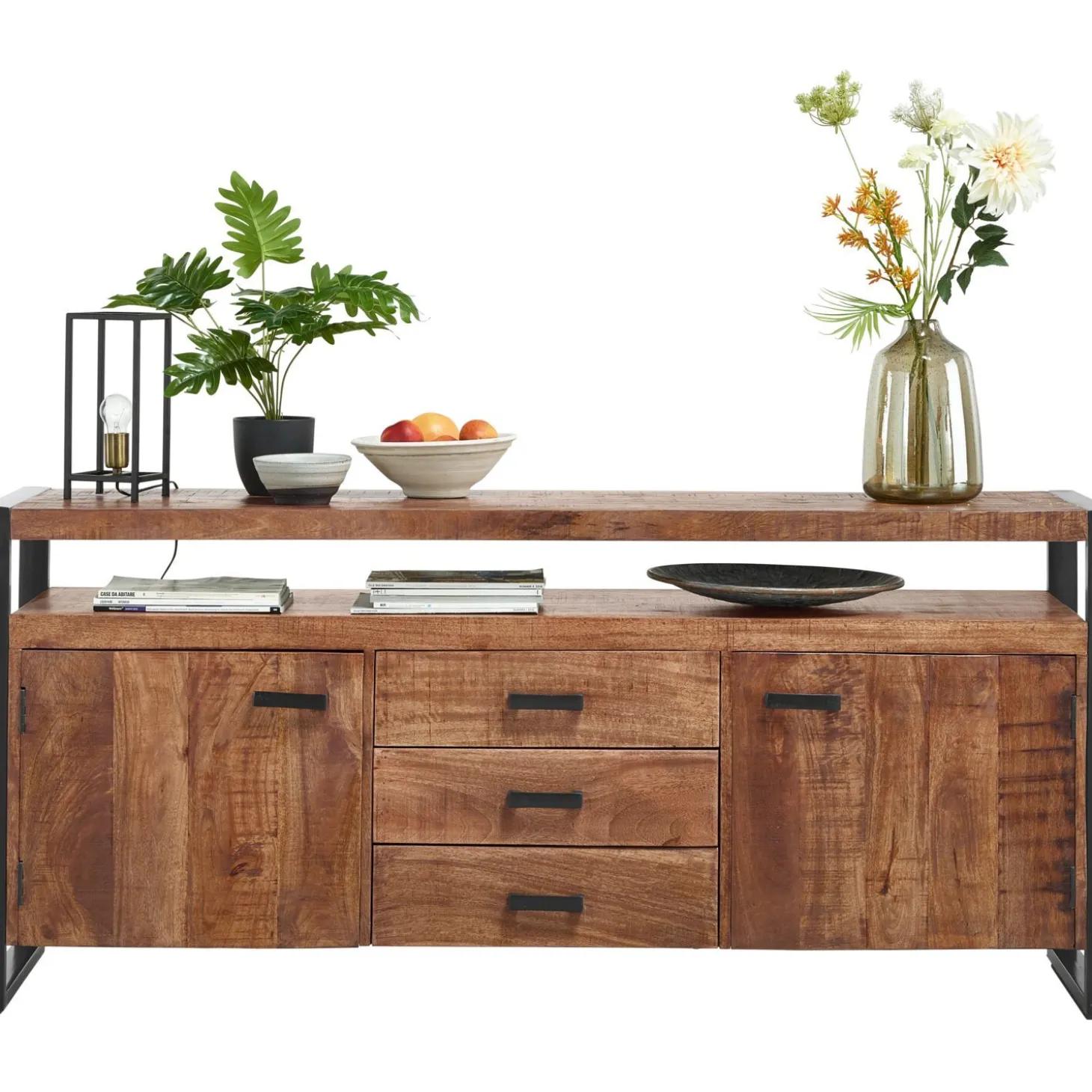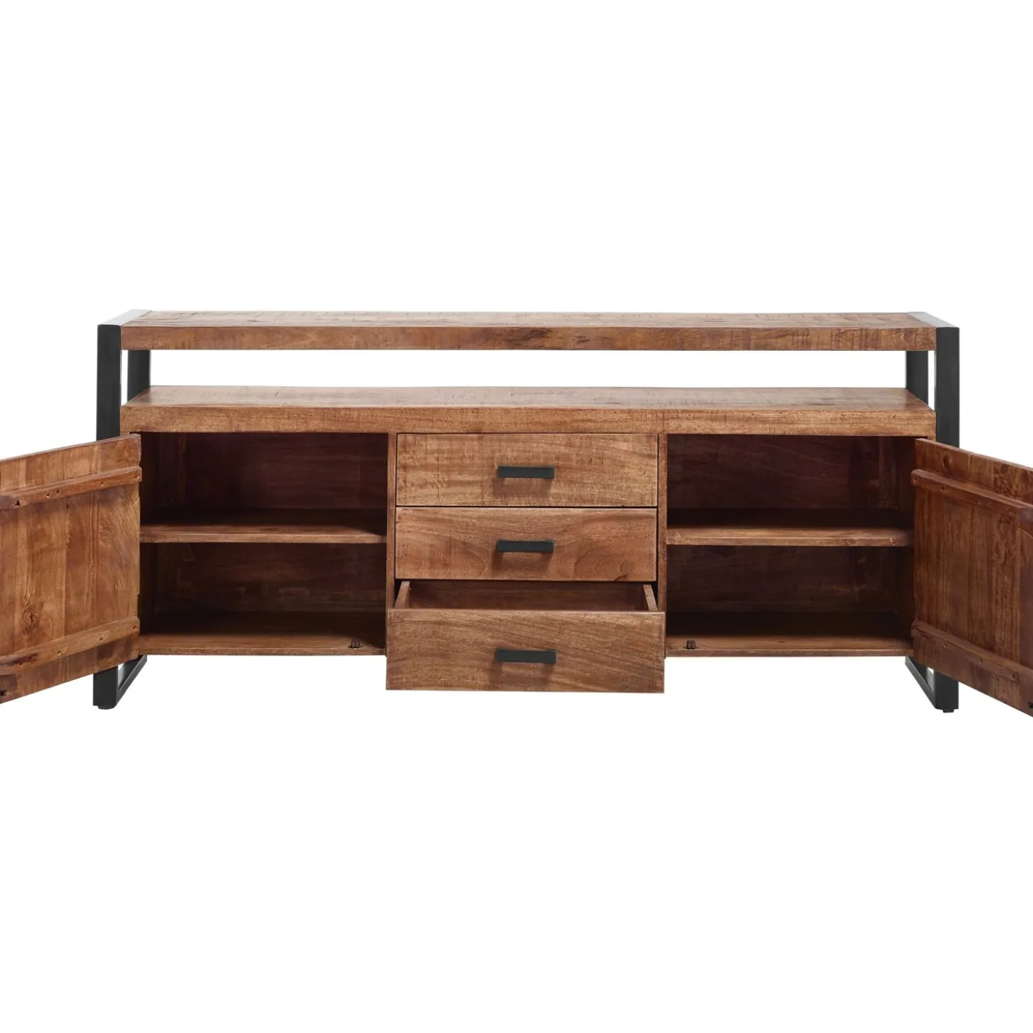 | Uitvoering | Uitgevoerd in mangohout in de kleur new weather barn met zwart metalen frame met 2 deuren en 3 laden. |