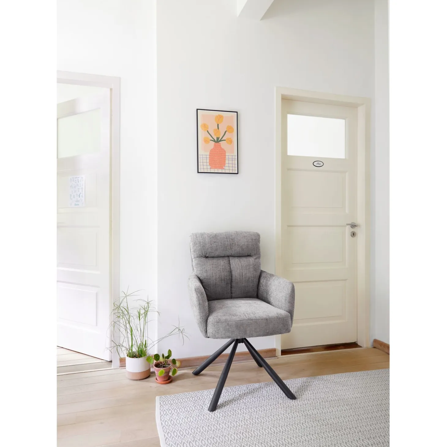 | Uitvoering | Uitgevoerd in stof baltic taupe met pocketvering met een toplaag van polyetherschuim in de zitting en polyetherschuim in de rug en een mat zwart metalen poot met terugdraaimechanisme. |