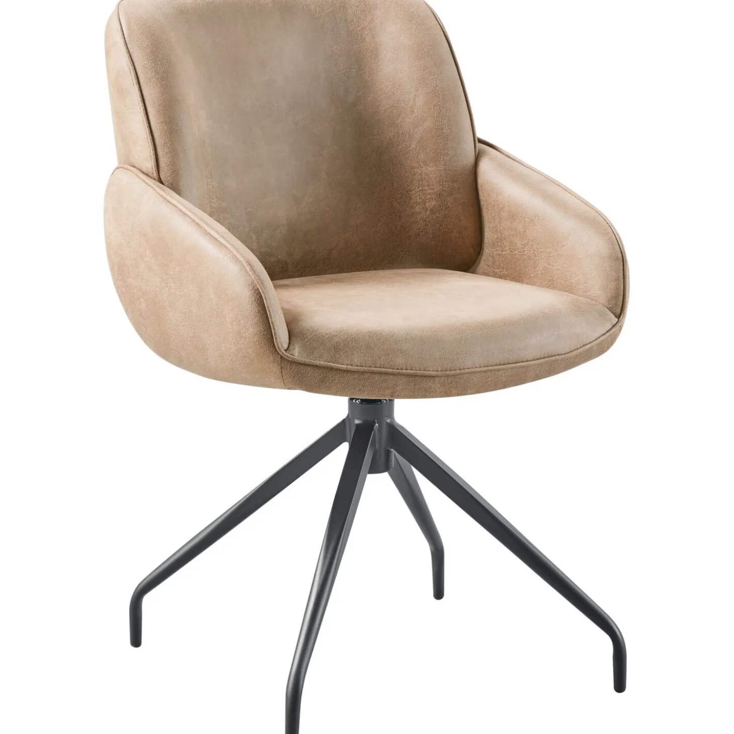 De Lusby armstoel is een heerlijk comfortabele stoel met een stevig zitcomfort, armleuningen en zwart metalen draaipoot. De stoel is bekleed met stof Chicago in een lichtbruine kleur. De stof heeft een zichtbare leernerf en voelt zacht aan. De armhoogte van de stoel is 64cm, goed om rekening mee te houden wanneer je ze onder een eettafel wilt plaatsen.