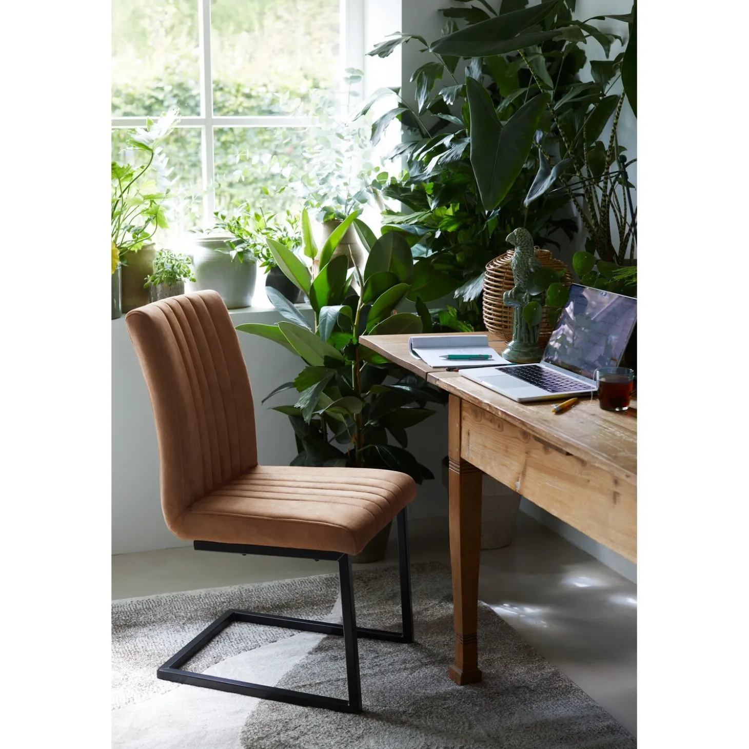 | Uitvoering | Uitgevoerd in stof rhino in de kleur cognac (PK970-5) met polyetherschuim in de zitting en de rug en metalen mat zwart gepoedercoated frame. |