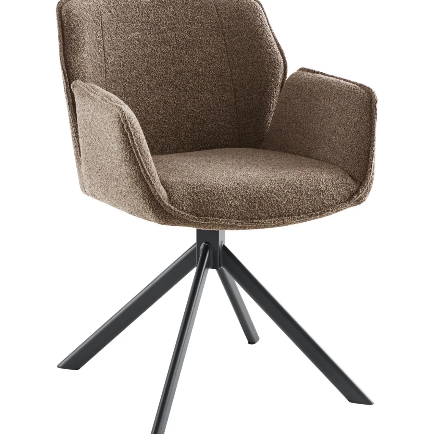De zwarte metalen poot van de stoel zorgt voor een moderne en toch tijdloze uitstraling. De elegantie van het zwarte metaal vormt een prachtig contrast met de bruine bouclé stof waarmee de stoel is bekleed. Bouclé stof bestaat uit los geweven patronen, draden en lussen. Ondanks de onregelmatige structuur die hierdoor ontstaat, voelt de stof lekker zacht en warm aan. De rugleuning is voorzien van 2 verticale sierstiksels en de stiknaden zijn afgewerkt met een fraaie vlindernaad.