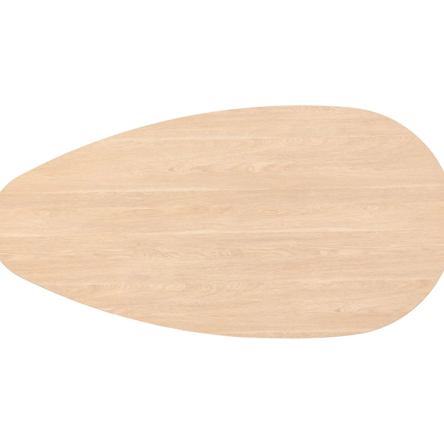 Eettafel Levado heeft een bijzonder organisch blad, dat zie je niet elke dag! Het blad heeft een dikte van 28 mm in een frisse houtkleur, met een lengte van 200 cm en een breedte van 100 cm op het breedste punt. De tafel is voorzien van een spinpoot, waarbij de buizen mooi rond zijn. Dit maakt het vriendelijke uiterlijk van de tafel helemaal af.