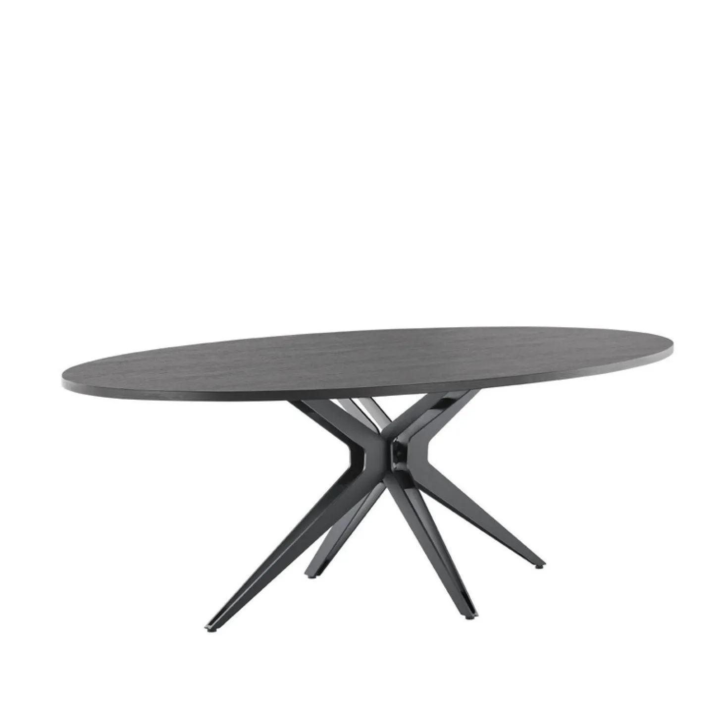 Eettafel Levado heeft een ovaal blad met een dikte van 28 mm in de kleur zwart met een lengte van 225 cm en een breedte van 120 cm en is voorzien van een zwarte metalen poot. De hoogte tot aan het onderblad (de ruimte vanaf de vloer tot de tafel) is 73 cm, dit is belangrijk als je er armstoelen aan wilt zetten. De poot van de tafel is met behulp van de handleiding eenvoudig te monteren.