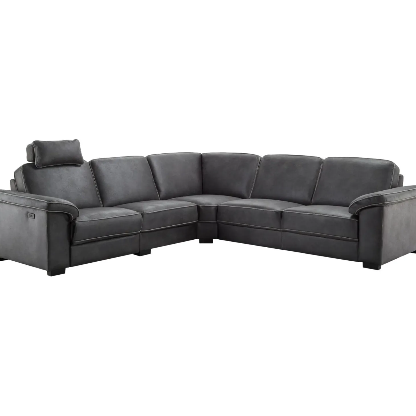 | Uitvoering | 2,5 zits arm links met elektrisch verstelbare relaxfunctie (1 motor) voorstaand links met zwarte bedieningsknop 3A (+USB) + grote hoek + 2,5 zits arm rechts met armleuning 1 (B25 cm), uitgevoerd in microleder camel 46-antraciet met bies in microleder camel 20-stone, grijs contrast stiksel, HR-koudschuim met een toplaag van traagschuim in de zitting, mix van polyetherschuimstaafjes en -vlokken in de rug en zwarte houten poten type FLV (5 cm). Inclusief hoofdsteun HS 20 in microleder camel 46-antraciet met bies in microleder camel 20-stone en grijs contraststiksel. |