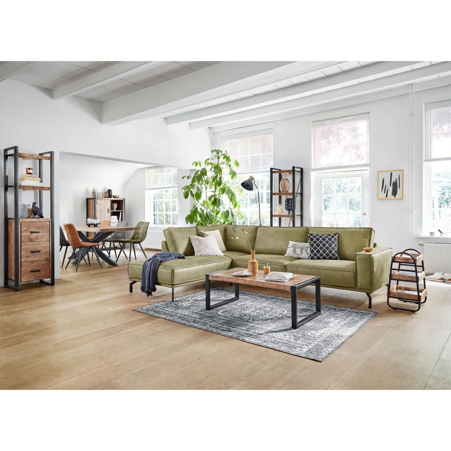 | Uitvoering | Hoek met eiland links + 3 zits arm rechts, uitgevoerd in microleder bull 59-moss met HR-koudschuim in de zitting, mix van polyetherschuim- en siliconenvlokken in de rug en zwarte metalen poten hoogte 17 cm. |