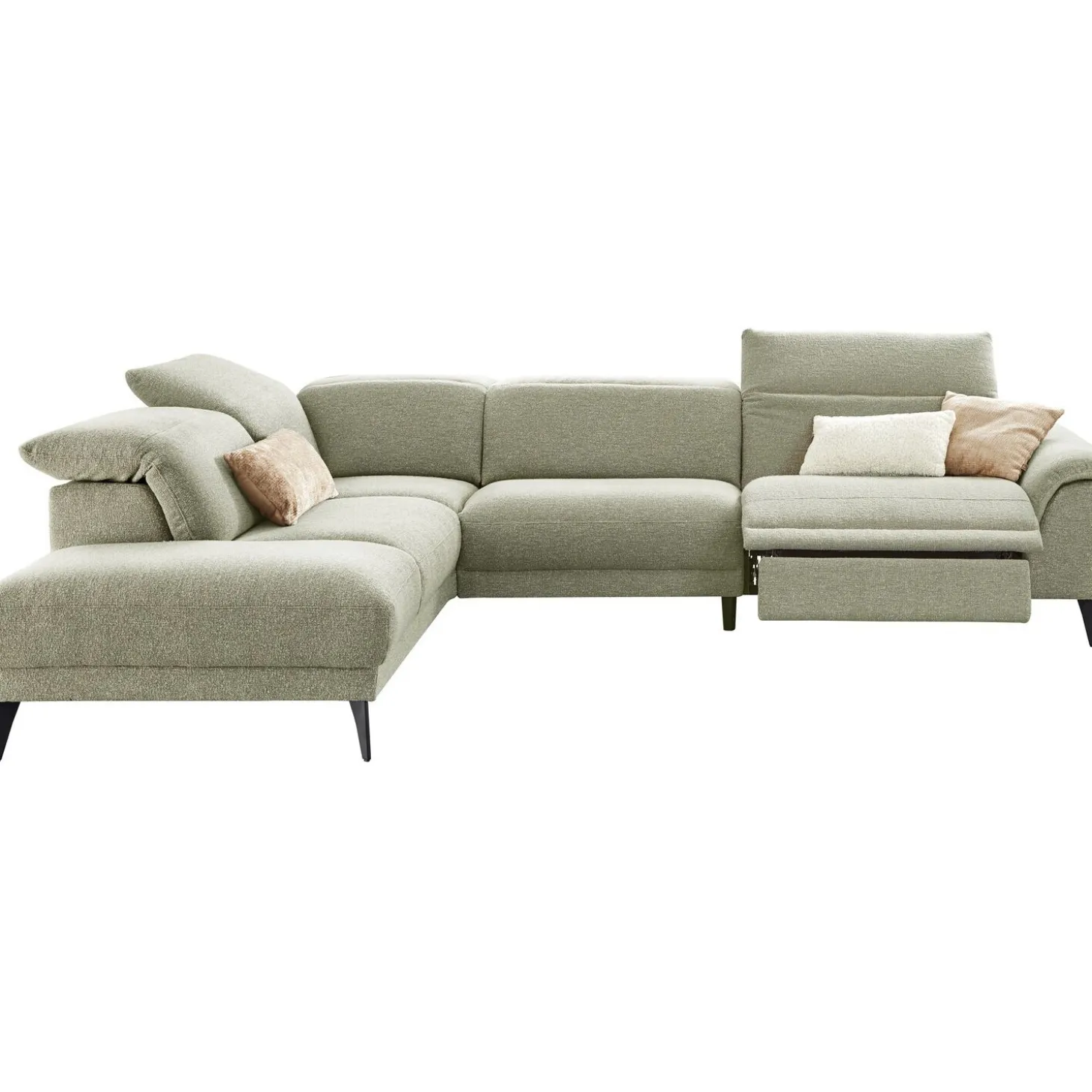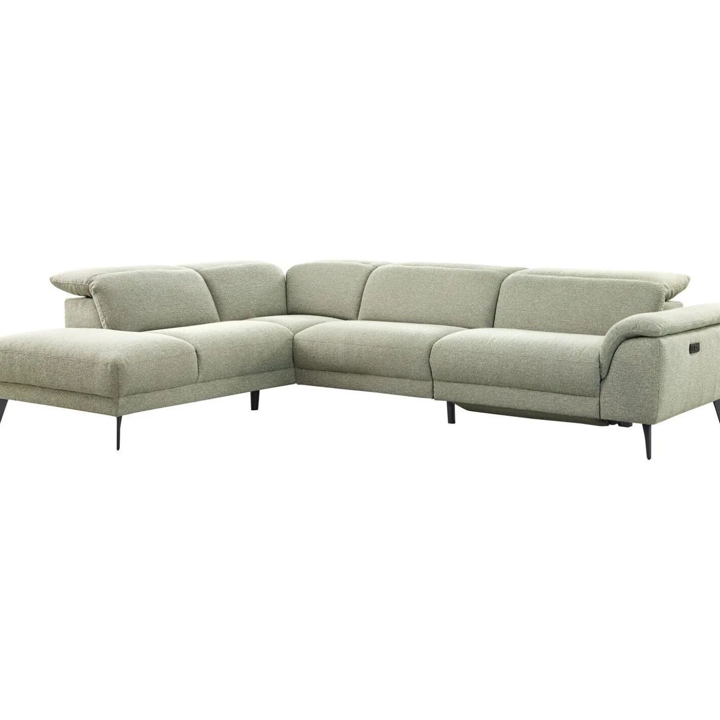 | Uitvoering | Hoek met eiland links + 1,5 zits (90) zonder armen + 1,5 zits (90) arm rechts met elektrische relaxfunctie en verstelbare hoofdsteun uitgevoerd in stof lodge 206-thyme met pocketvering met een toplaag van HR-koudschuim in de zitting, HR-koudschuim in de rug en zwarte metalen poten type 2O1K. |