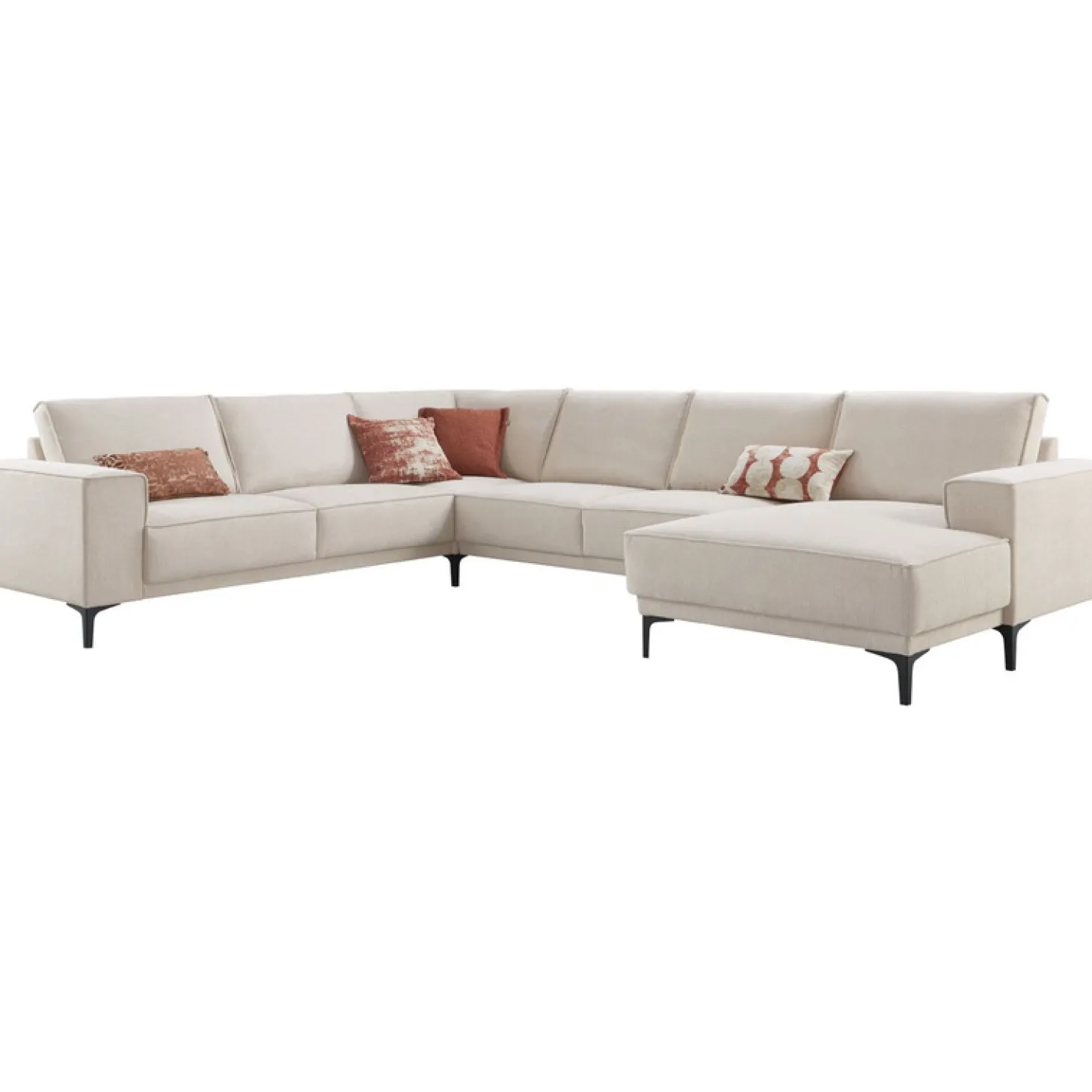 | Uitvoering | 2,5 zits arm links + hoek + 2,5 zits zonder armen + chaise longue arm rechts in stof mito 01-natural met brede armleuningen, HR-koudschuim in de zitting, mix van polyetherschuim- en siliconenvlokken in de rug en zwarte T-poten type 12234 H-150. |