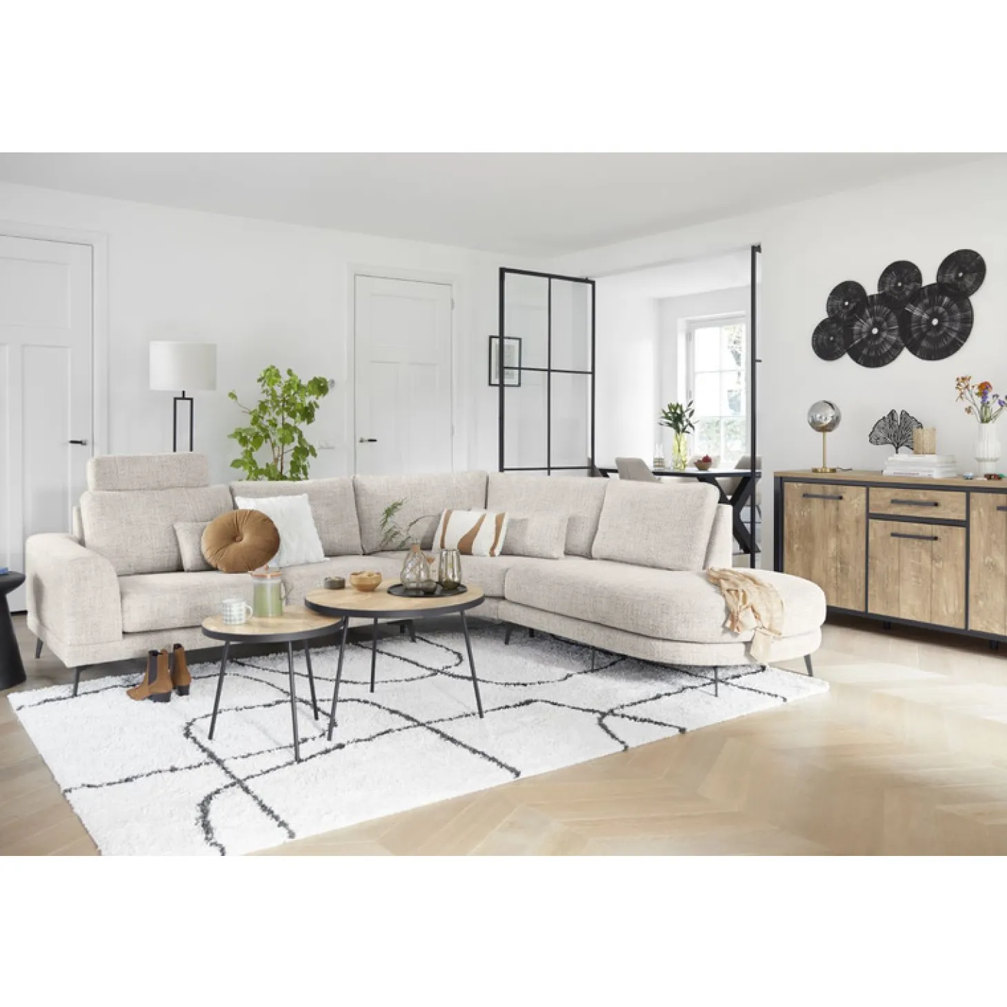 Model Flandria heeft een trendy uitstraling door zijn ronde vormgeving. De bank is bekleed in stof oasis. Dit is een geweven stof en is iets wat gemêleerd, wat een leuk speels effect geeft. De zwart metalen poten maken deze trendy hoekbank helemaal af.