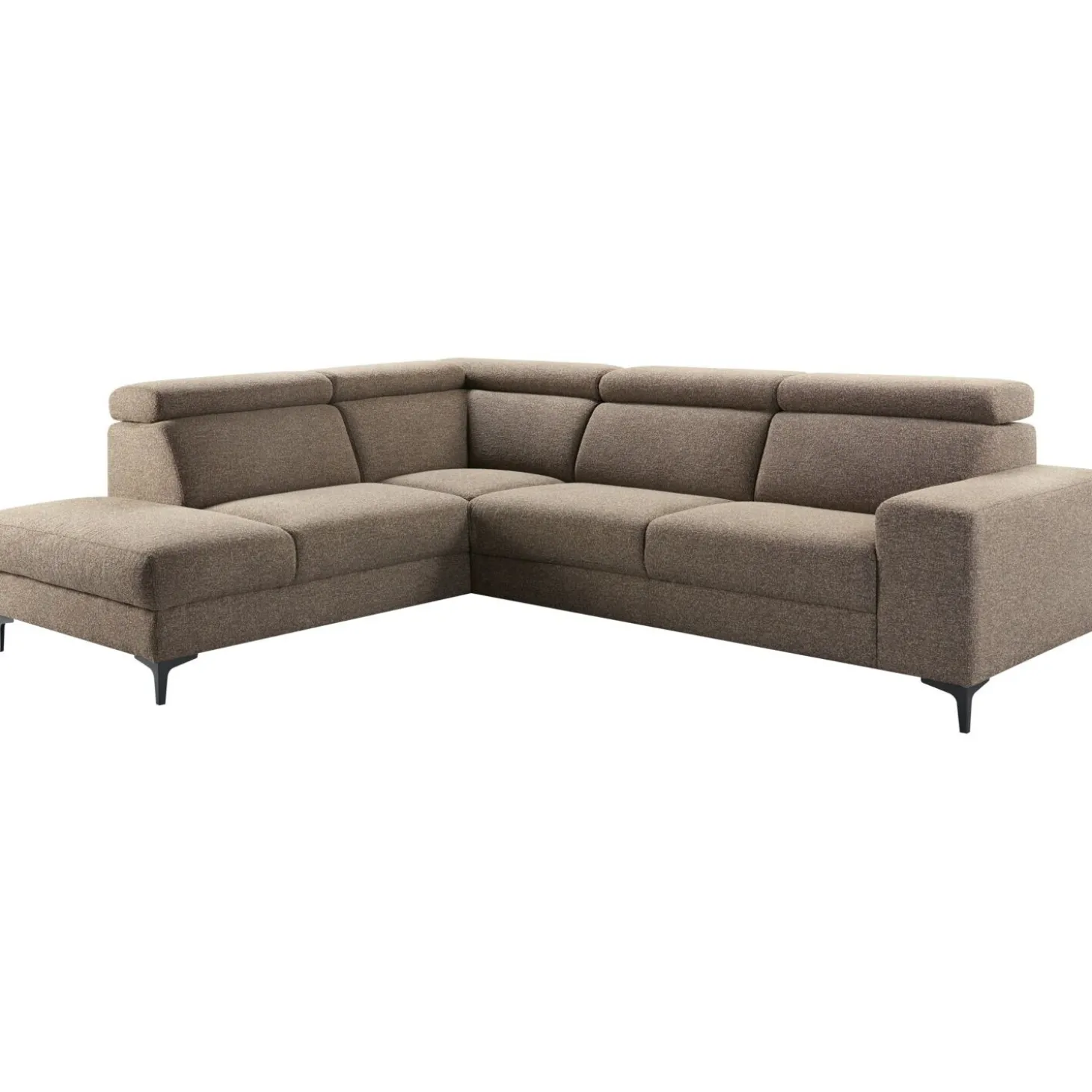| Uitvoering | Hoek met eiland (75) links + 2,5 zits arm rechts, uitgevoerd in stof lodge 176-sepia met HR-koudschuim met een toplaag van traagschuim in de zitting, polyetherschuim in de rug en zwart metalen poten, type 3224 (hoogte 12 cm). |