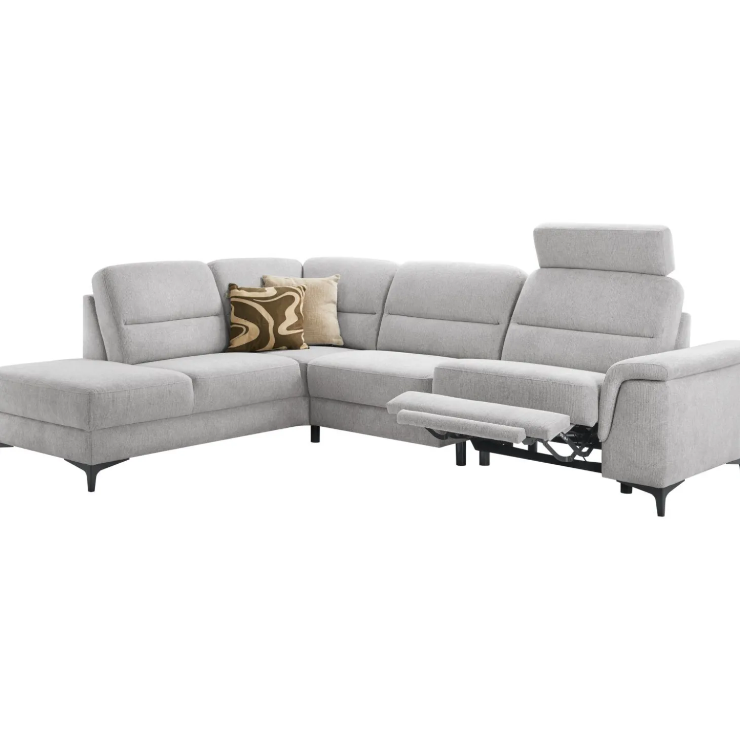| Uitvoering | Hoek met eiland links 1 zits (80) zonder armen + 1 zits (80) arm rechts met elektrische relaxfunctie en verstelbare hoofdsteun 70 cm in stof mito 40-ash grey met arm D, hoge rug, polyetherschuim in de zitting, polyetherschuim in de rug en zwarte metalen poten, type MF4 (hoogte 12 cm). |