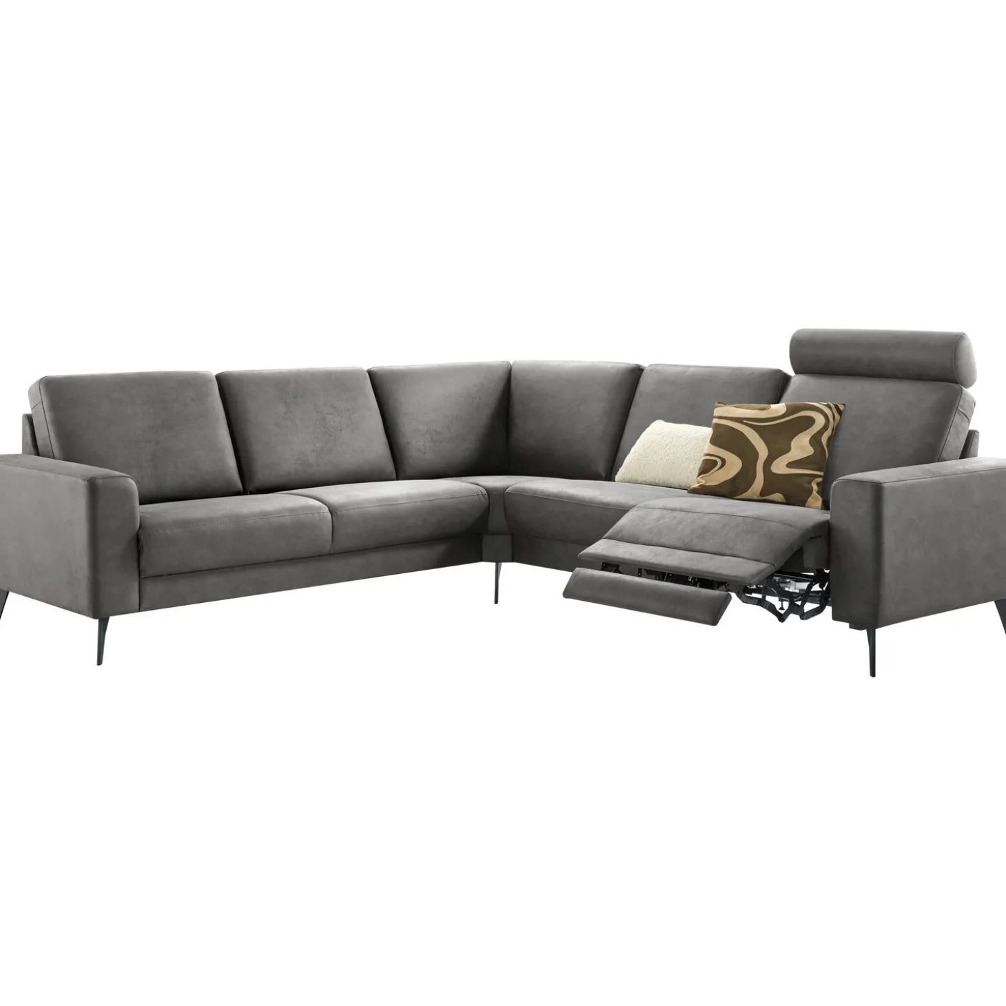| Uitvoering | 2,5 zits arm links + hoek klein afgeschuind + 1,5 zits (70) zonder armen + 1,5 zits (70) ar met relax en hoofdsteun, uitgevoerd in microleder bull 67-antraciet, met arm A, voorregel, hoge rug, HR-koudschuim in de zitting, HR-koudschuim in de rug en zwarte metalen poten (201K). |