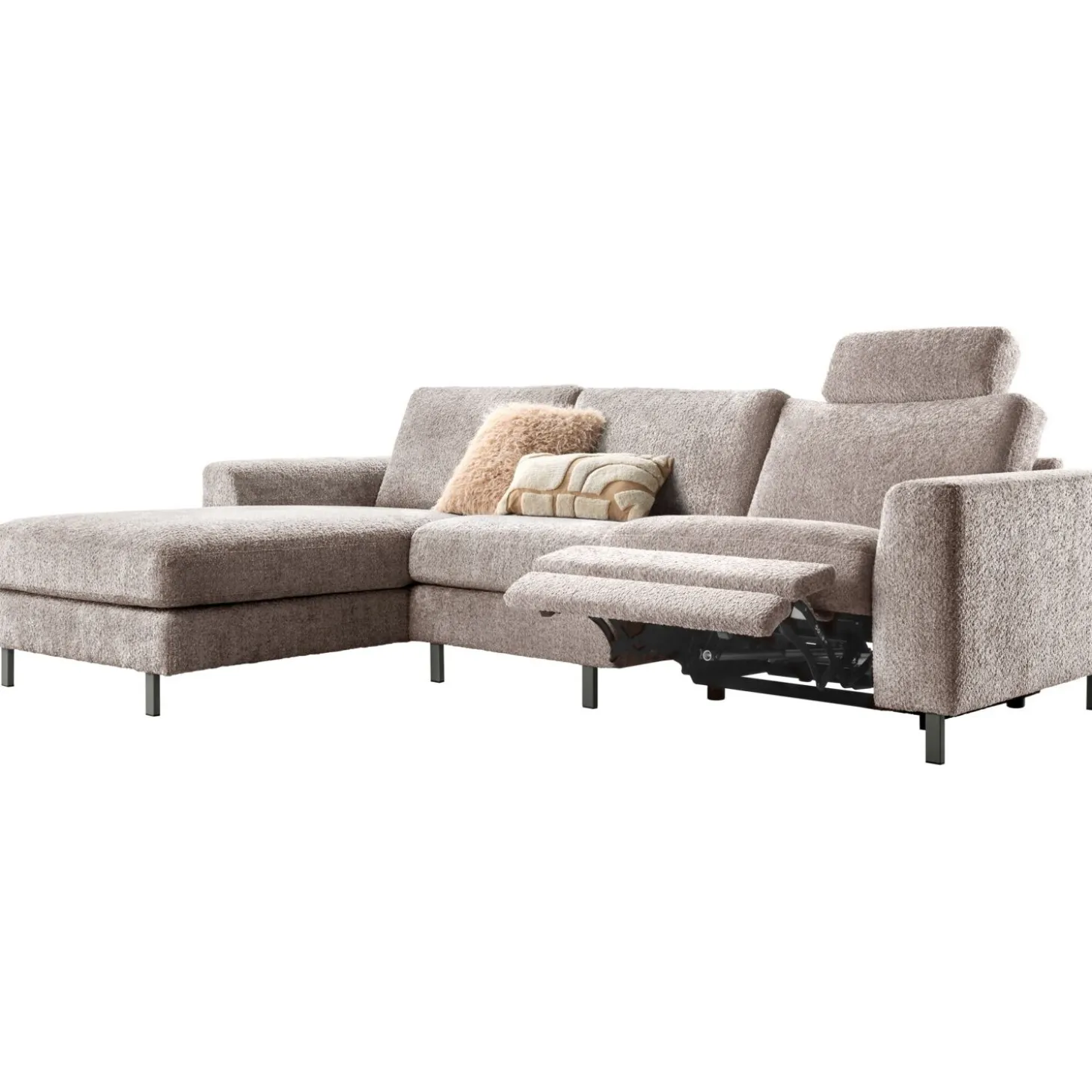 | Uitvoering | Longchair groot arm A links + 1 zits (80) zonder armen + 1 zits (80) arm A rechts met elektrische relaxfunctie en hoofdsteun 60 (met beugel in de kleur perle brown), uitgevoerd in stof venga 12-taupe met polyetherschuim in de zitting, een mix van polyetherschuim- en siliconenvlokken in de rug en metalen poten type MF5 in de kleur perle brown (hoogte 12 cm). |