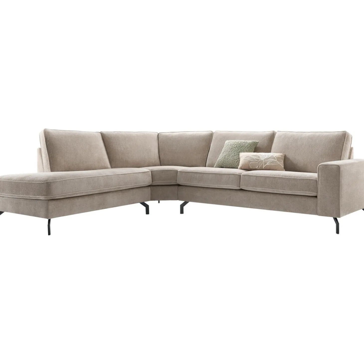 | Uitvoering | 2,5 zits arm C links + trapezehoek + 1 zits met eiland rechts, uitgevoerd in stof stella 10-liver met vlindernaad, polyetherschuim in de zitting, een mix van polyetherschuim- en siliconenvlokken in de rug en zwart metalen poten type MF8 (hoogte 15 cm) |