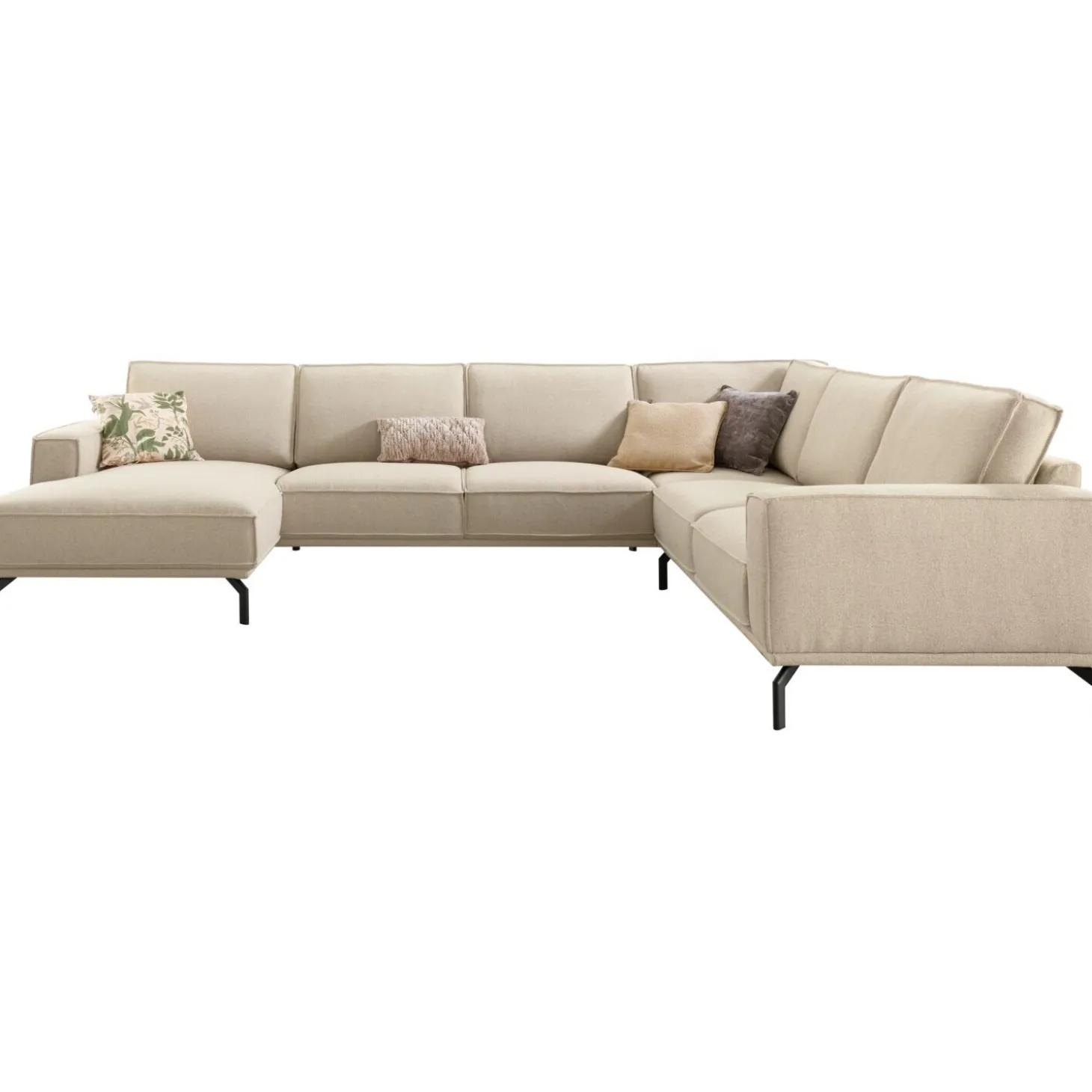 | Uitvoering | Longchair arm links + 2,5 zits zonder armen + hoek + 2,5 zits arm rechts uitgevoerd in stof glory 05-beige met HR-koudschuim in de zitting, mix van polyetherschuim- en siliconenvlokken in de rug en zwarte metalen poten (hoogte 17 cm). |