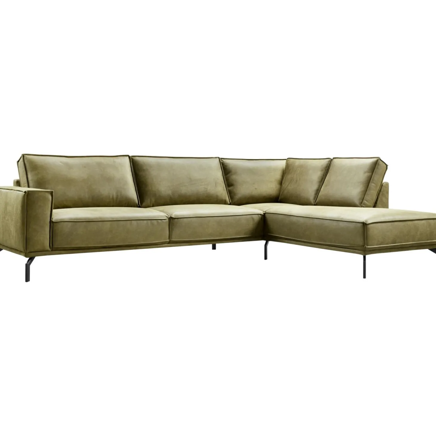 | Uitvoering | 3 zits arm links + hoek met eiland rechts, uitgevoerd in microleder bull 59-moss met polyetherschuim in de zitting, mix van polyetherschuim- en siliconenvlokken in de rug en zwart metalen poten hoogte 17 cm. |