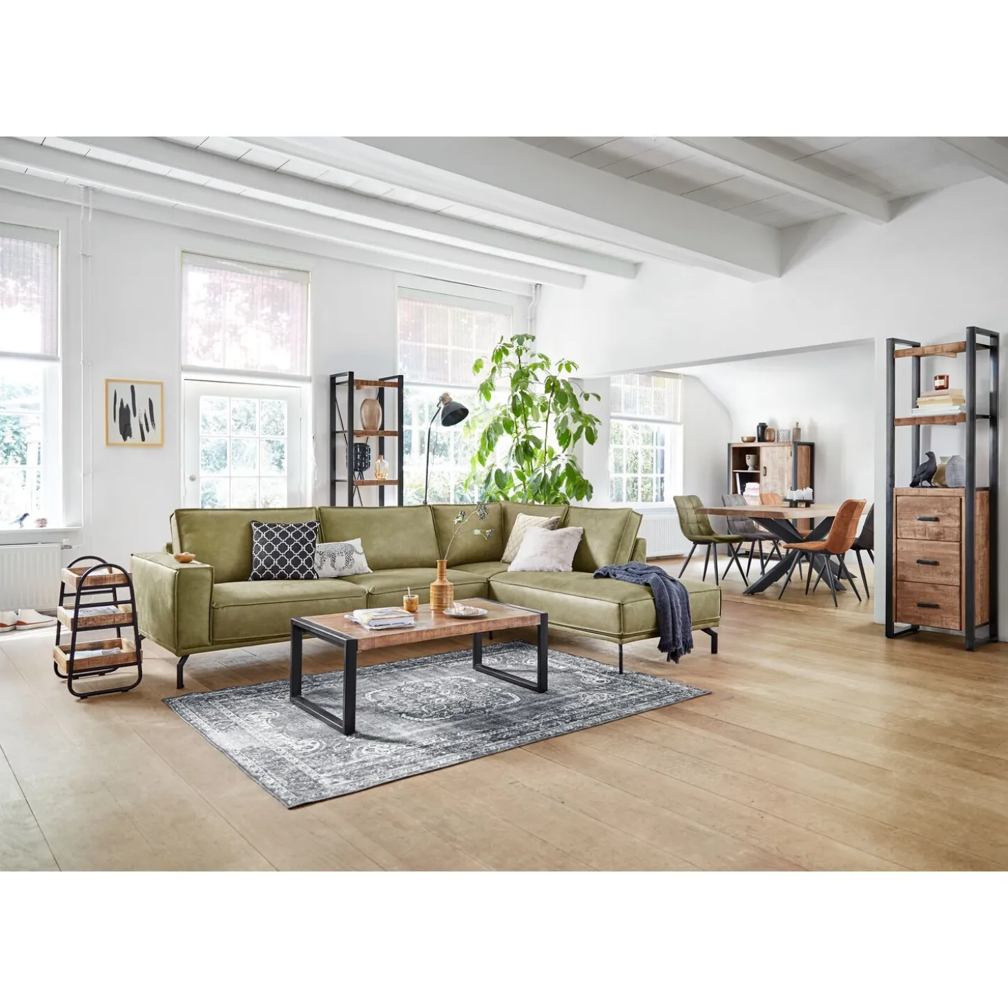 | Uitvoering | 3 zits arm links + hoek met eiland rechts, uitgevoerd in microleder bull 59-moss met HR-koudschuim in de zitting, mix van polyetherschuim- en siliconenvlokken in de rug en met zwarte metalen poten hoogte 17 cm. |