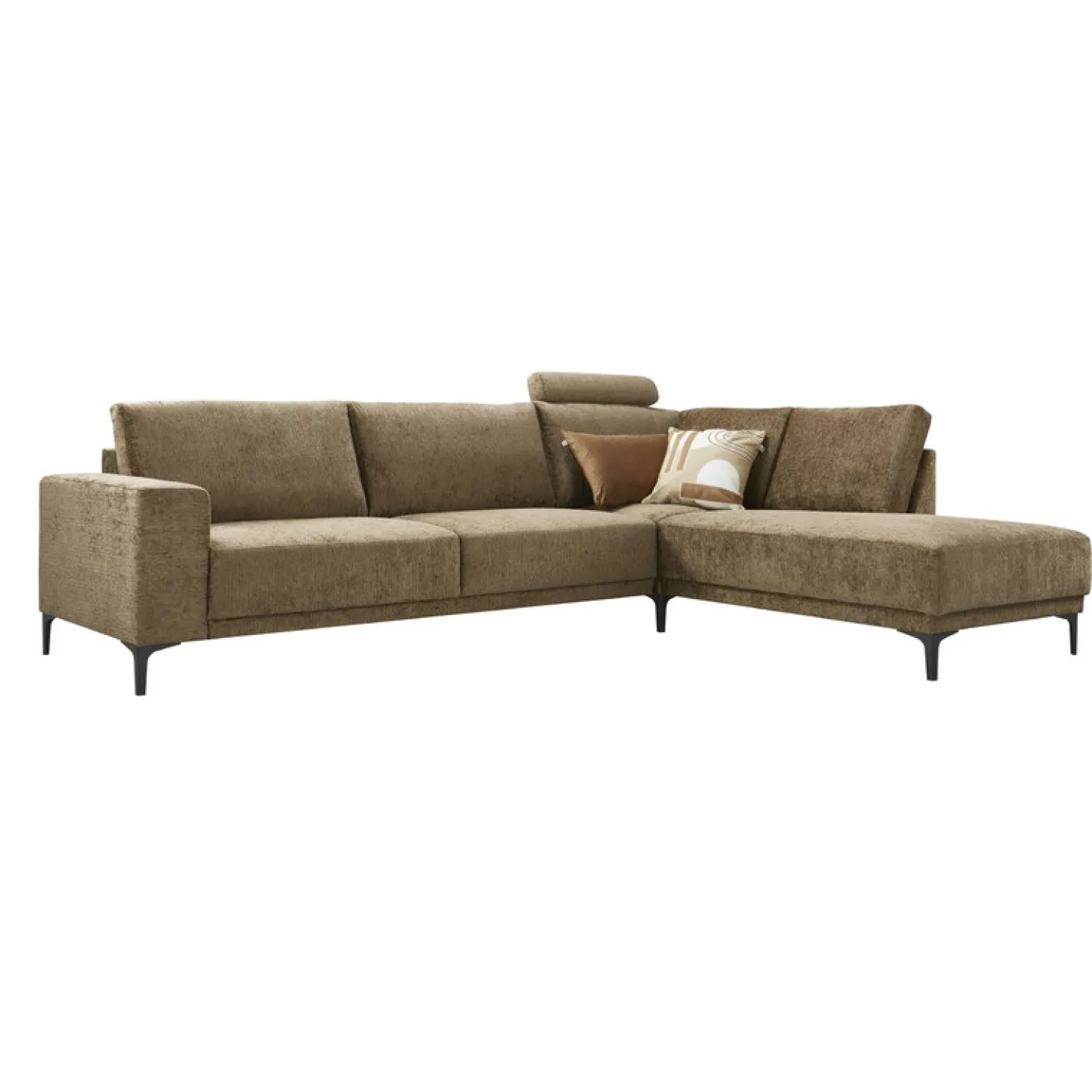 | Uitvoering | 3 zits arm links + hoek met eiland rechts in stof fusion 127-brandy met brede armleuning (arm A), hoofdsteun, HR-koudschuim in de zitting, mix van polyetherschuim- en siliconenvlokken in de rug en zwarte metalen T-poten type 12234 H150. |