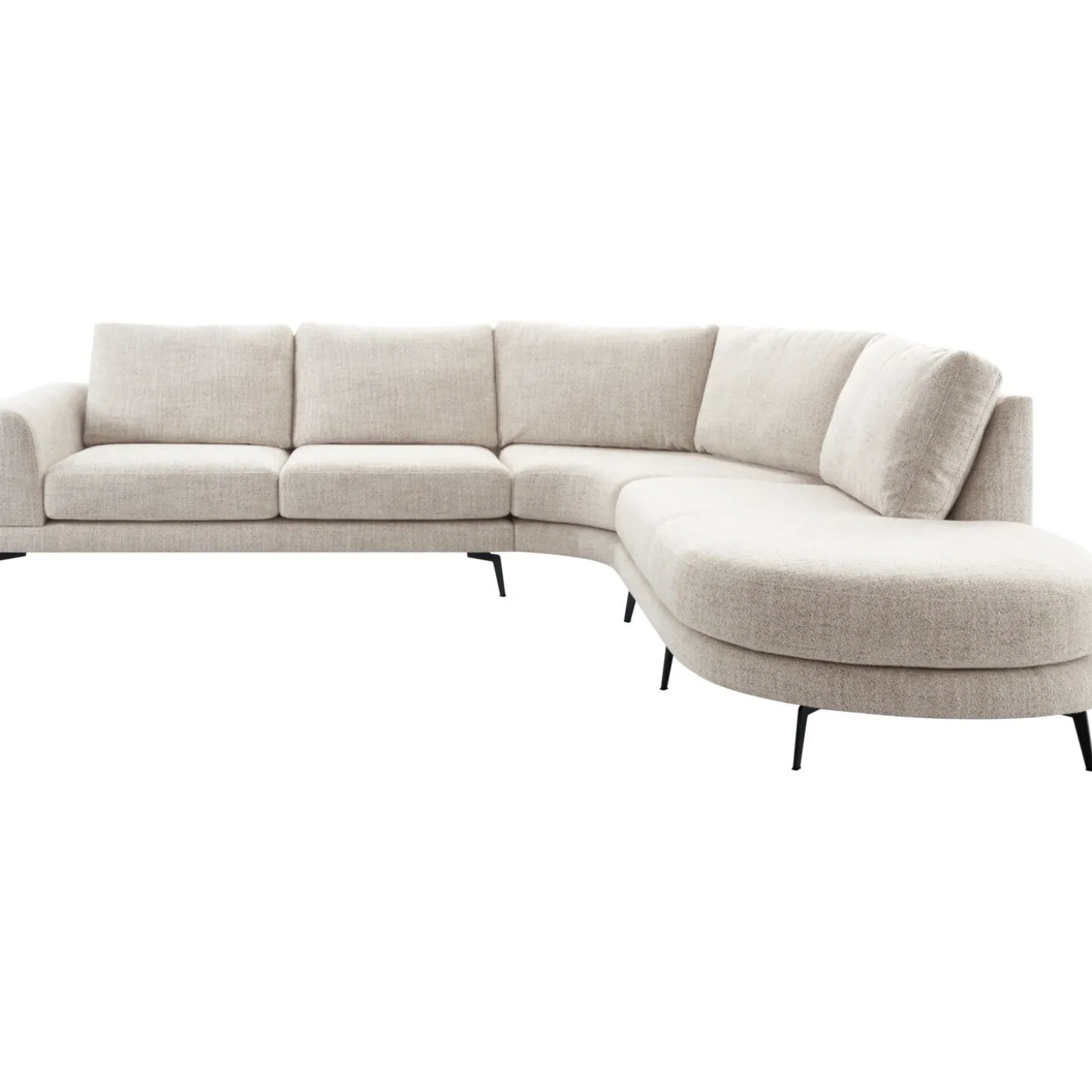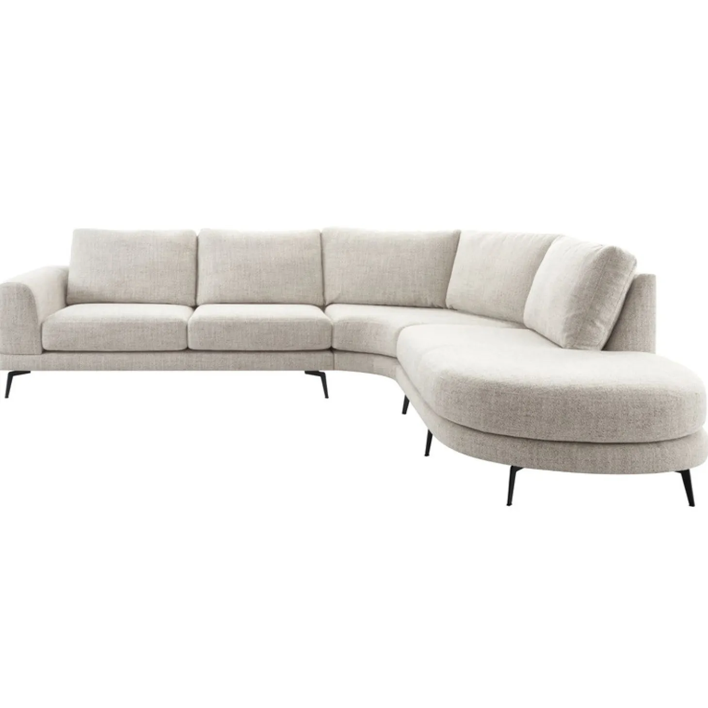 | Uitvoering | 2,5 zits arm links + hoekelement rond + 1 zits met eiland rond rechts uitgevoerd in stof oasis 91-bisque met polyetherschuim met een toplaag van HR-koudschuim in de zitting, mix van polyetherschuim- en siliconenvlokken in de rug en zwarte metalen poten, type M-15 (15 cm) |