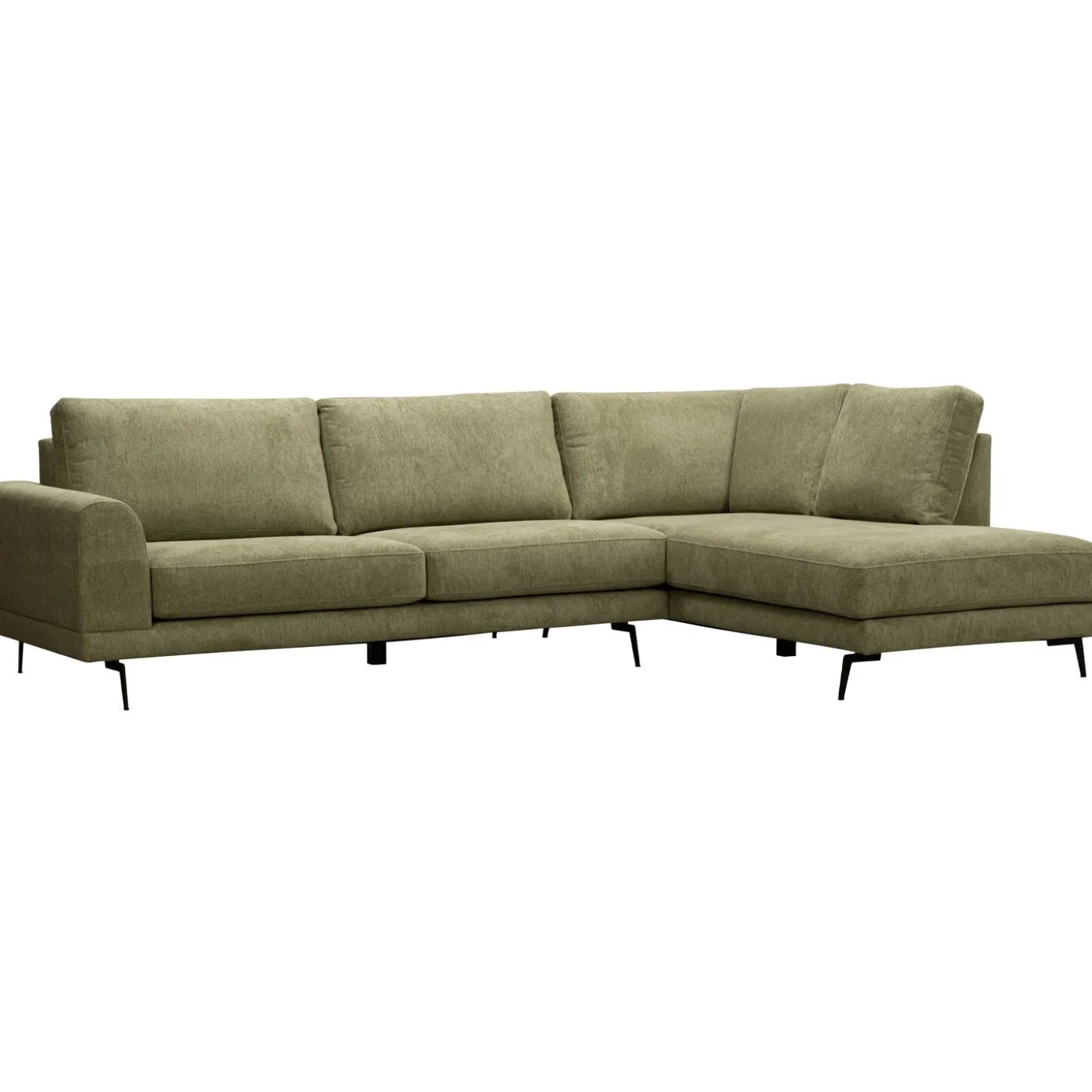 | Uitvoering | 3 zits arm links + hoek met eiland rechts, uitgevoerd in stof mito 55-green met pocketvering met een toplaag van traagschuim in de zitting, HR-koudschuim met een afdeklaag van siliconenvlokken en donsveren in de rug en zwarte metalen poten, type M-15 (15 cm). |