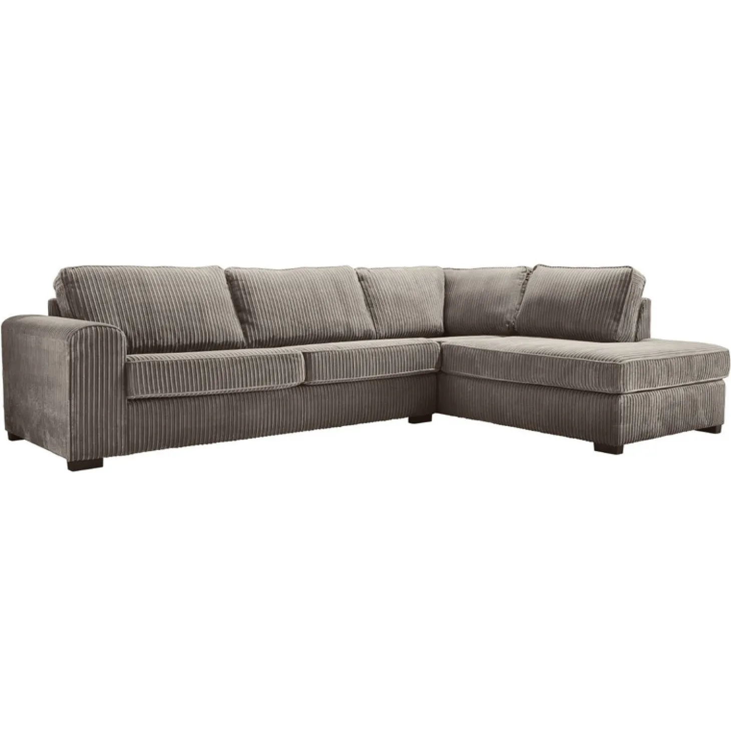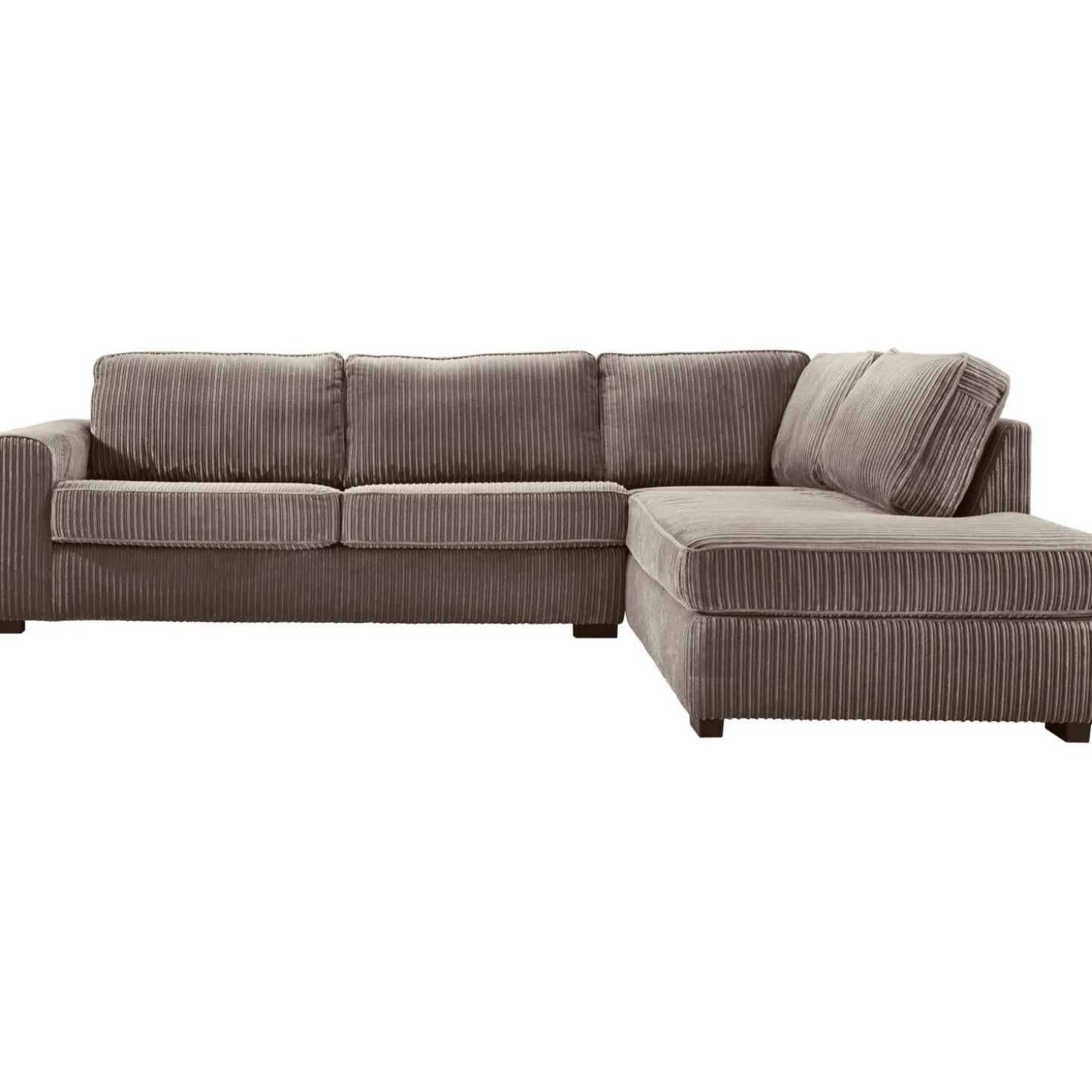 | Uitvoering | 3 zits arm links + hoek met eiland vlak 75 rechts, uitgevoerd in stof jumbo 24-mink met vast gestoffeerde romp, bies in stof jumbo 24-mink, HR-koudschuim in de zitting, mix van polyetherschuimstaafjes en -vlokken in de rug, diepe zit, ronde arm (breedte 24 cm) en zwarte kunststof poten type SYD-5 (hoogte 5 cm). |