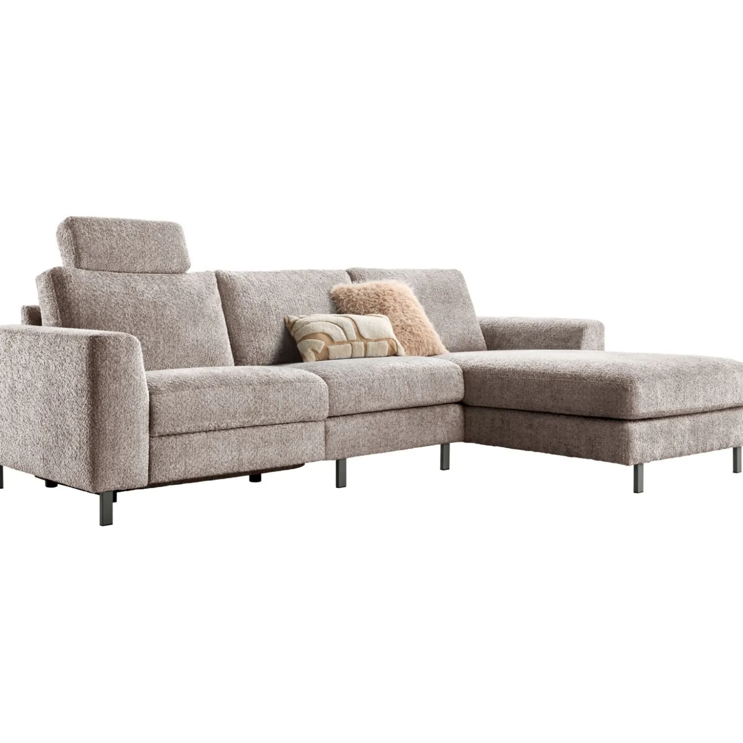 | Uitvoering | 1 zits (80) arm A links met elektrische relaxfunctie en hoofdsteun 60 (met beugel in de kleur perle brown) + 1 zits (80) zonder armen + chaise longue groot arm A rechts, uitgevoerd in stof venga 12-taupe met pocketvering op bonellvering met een toplaag van traagschuim in de zitting, HR-koudschuim met een toplaag van veren en siliconenvlokken in de rug en metalen poten type MF5 in de kleur perle brown (hoogte 12 cm). |