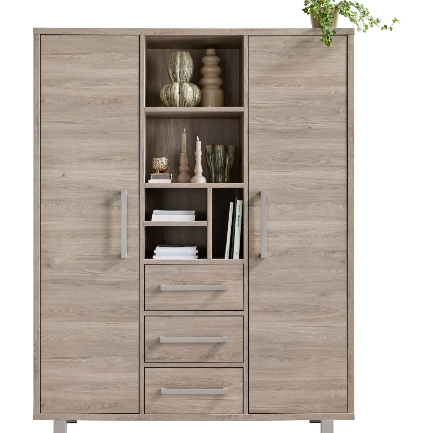 | Uitvoering | Uitgevoerd in de kleur grey oak met metalen handgrepen en poten in de kleur stone grey, met 2 deuren, 3 laden en 5 open vakken. |