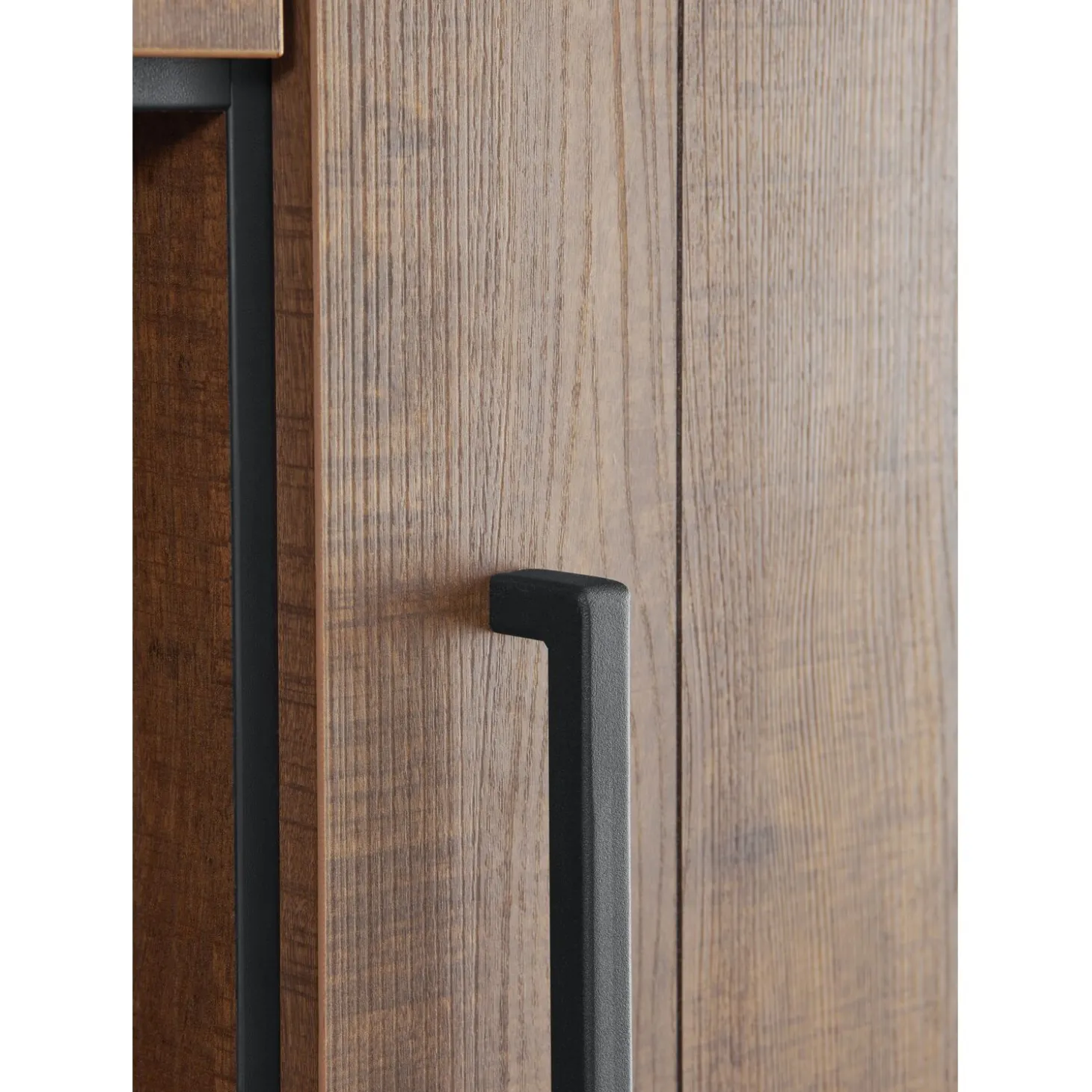 | Uitvoering | Uitgevoerd in de kleur dark mango met zwart metalen frame, 2 deuren, 3 laden en 2 open vakken. |