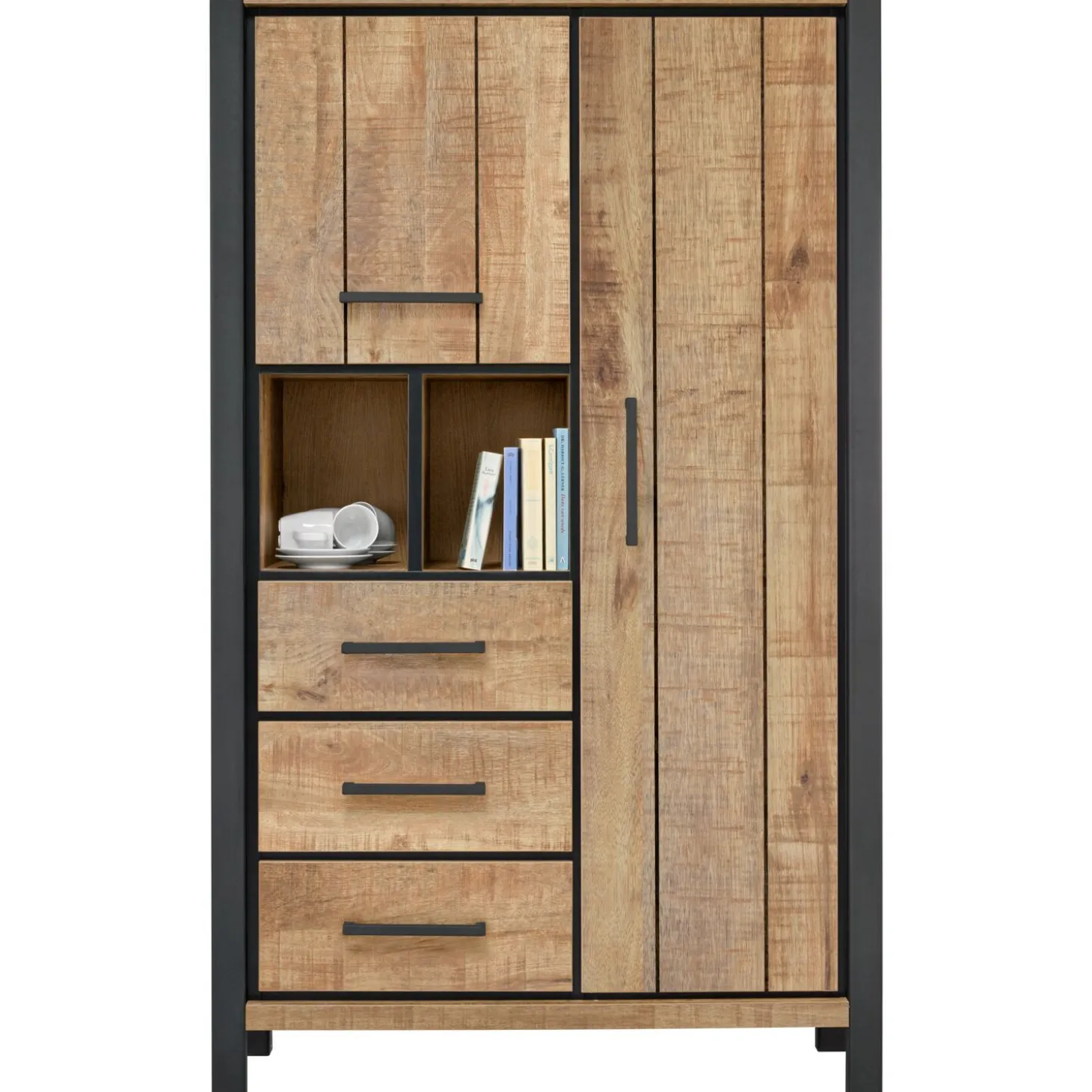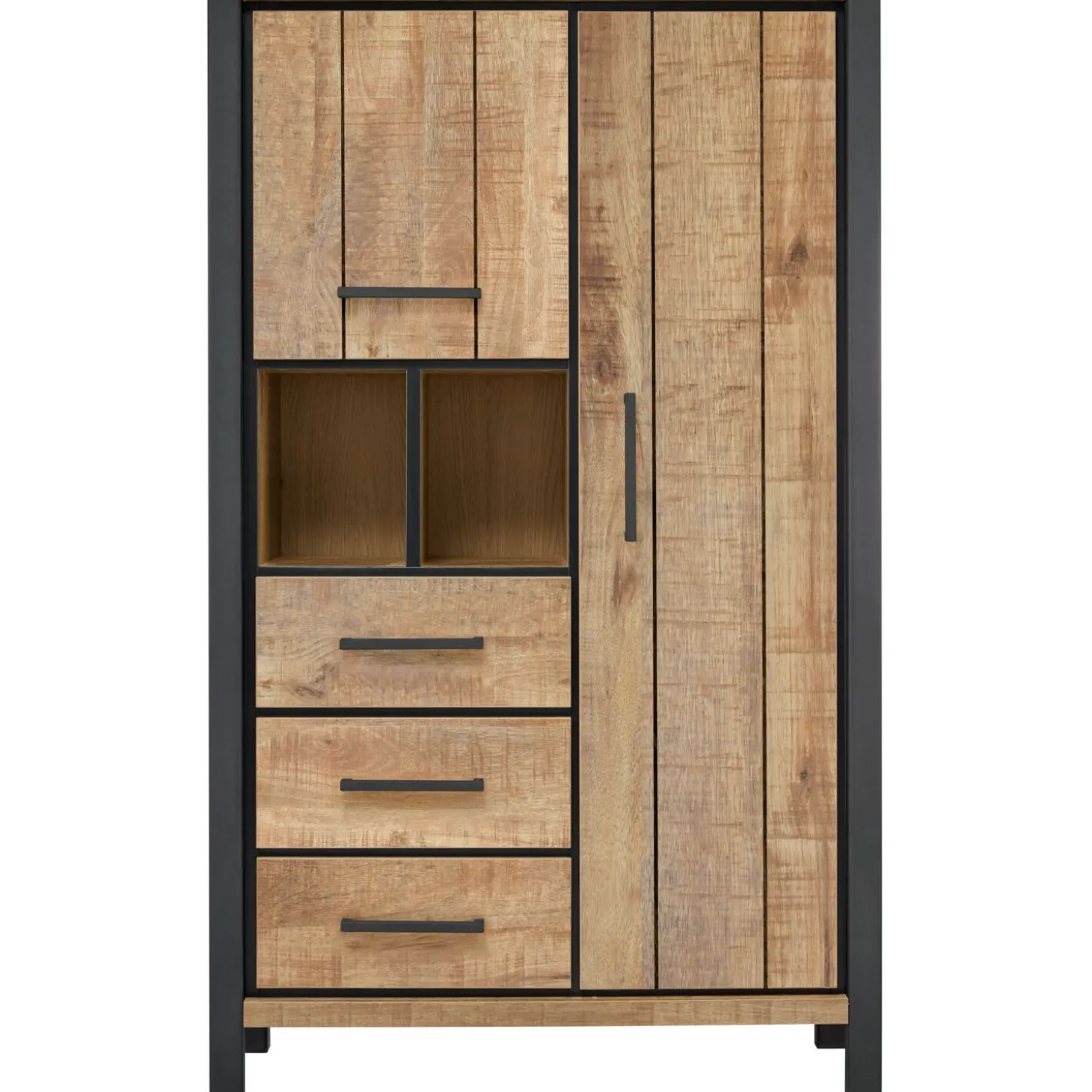 | Uitvoering | Uitgevoerd in de kleur mango met zwart metalen frame, 2 deuren, 3 laden en 2 open vakken. |