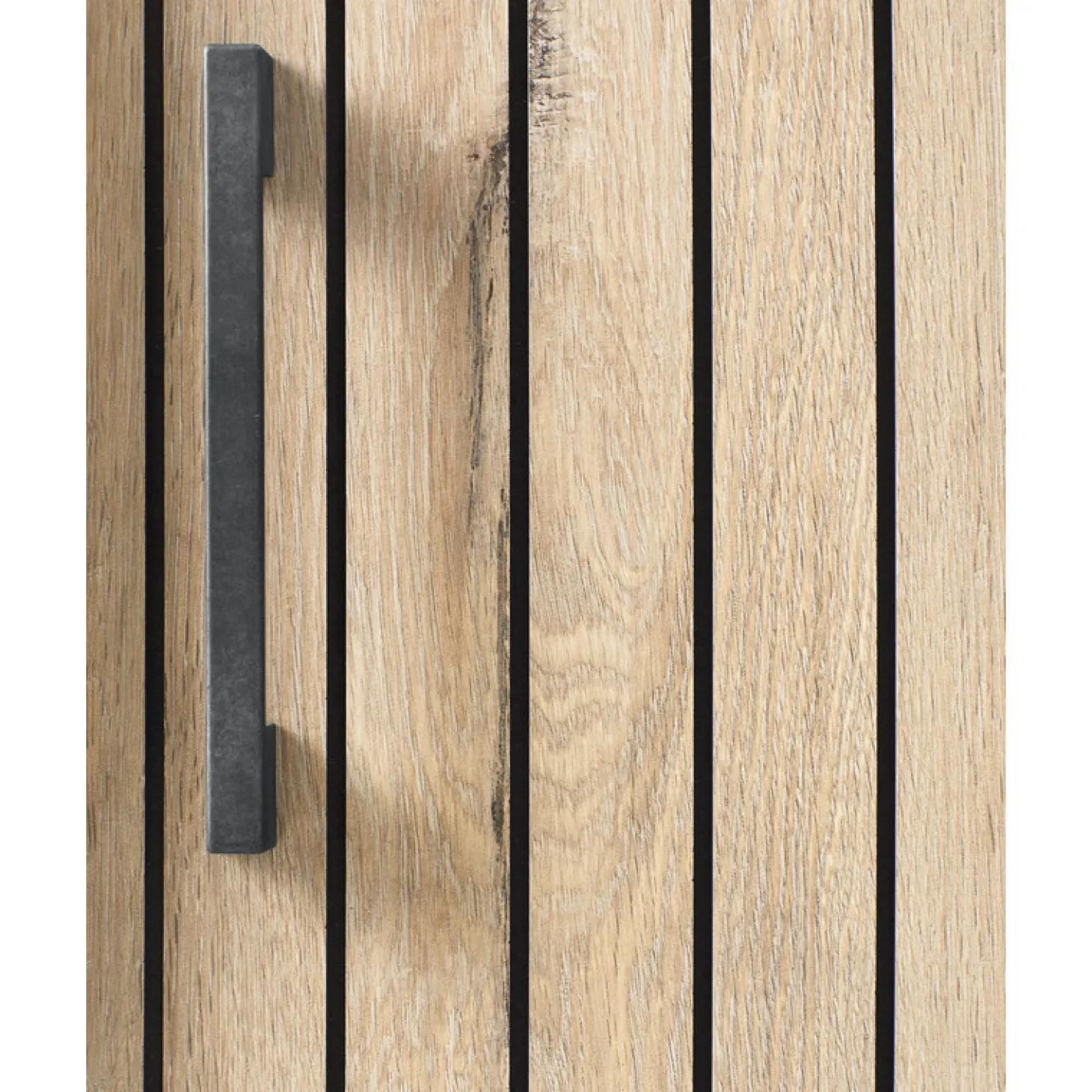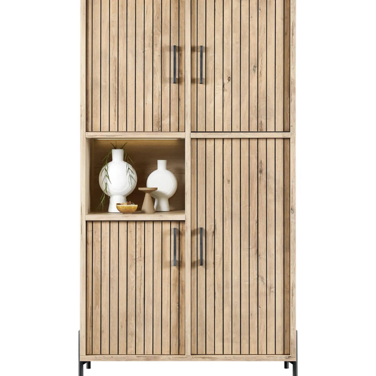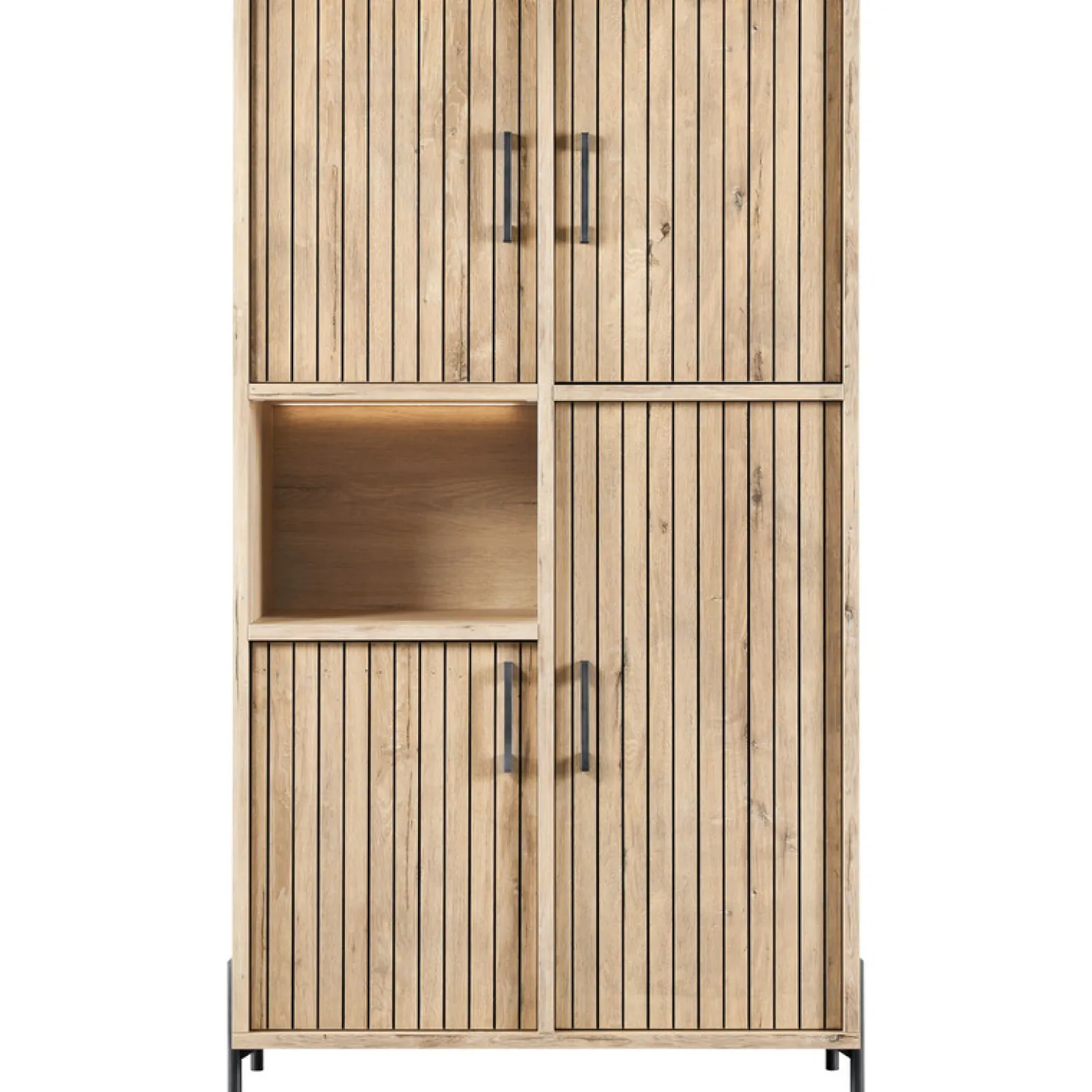 | Uitvoering | Uitgevoerd in de kleur Millenium Oak Nature met zwart metalen poten en handgrepen, 4 deuren en 1 open vak, incl. verlichting. |