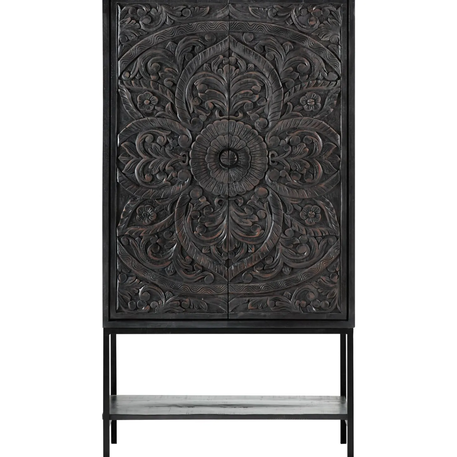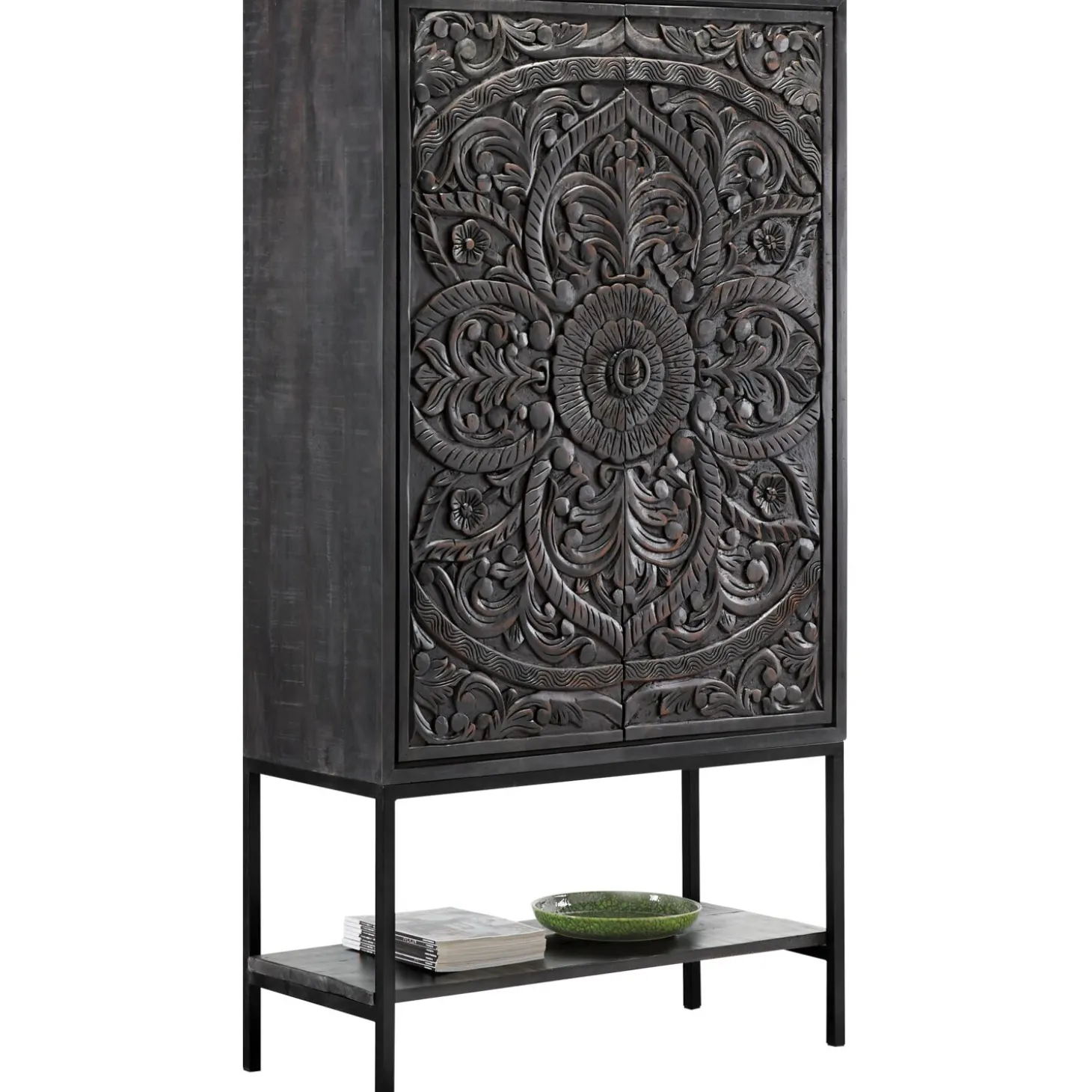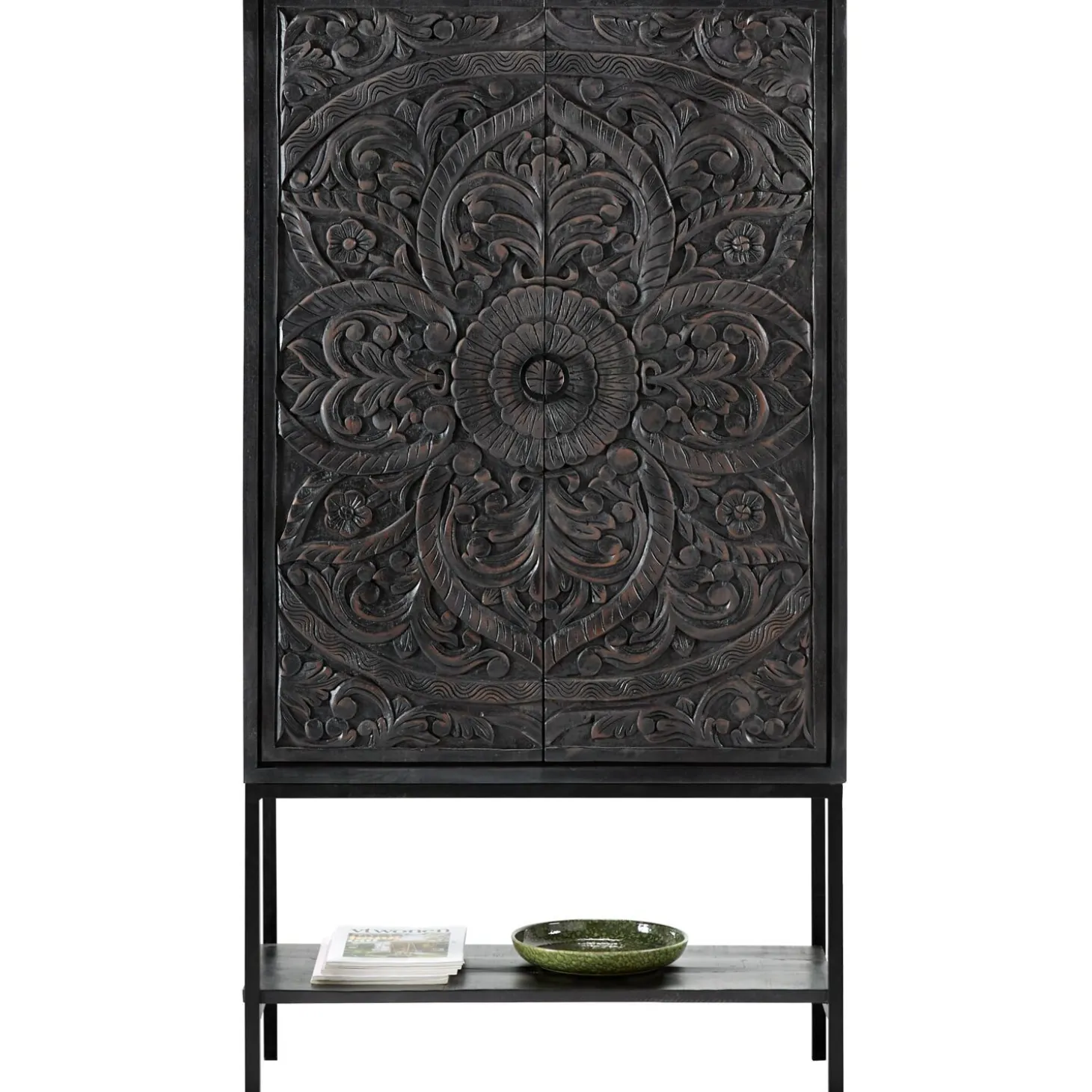 De hoge kast Montclair is gemaakt van een combinatie van mango en acacia hout in de kleur antique zwart en daarna afgelakt. Het houtsnijwerk is ambachtelijk gemaakt en dit geeft de kast een unieke uitstraling. Achter de deuren bevinden zich 3 legplanken voor extra veel opbergruimte. Naast deze kast kan je ook nog kiezen uit 2 verschillende formaten tv-meubels.