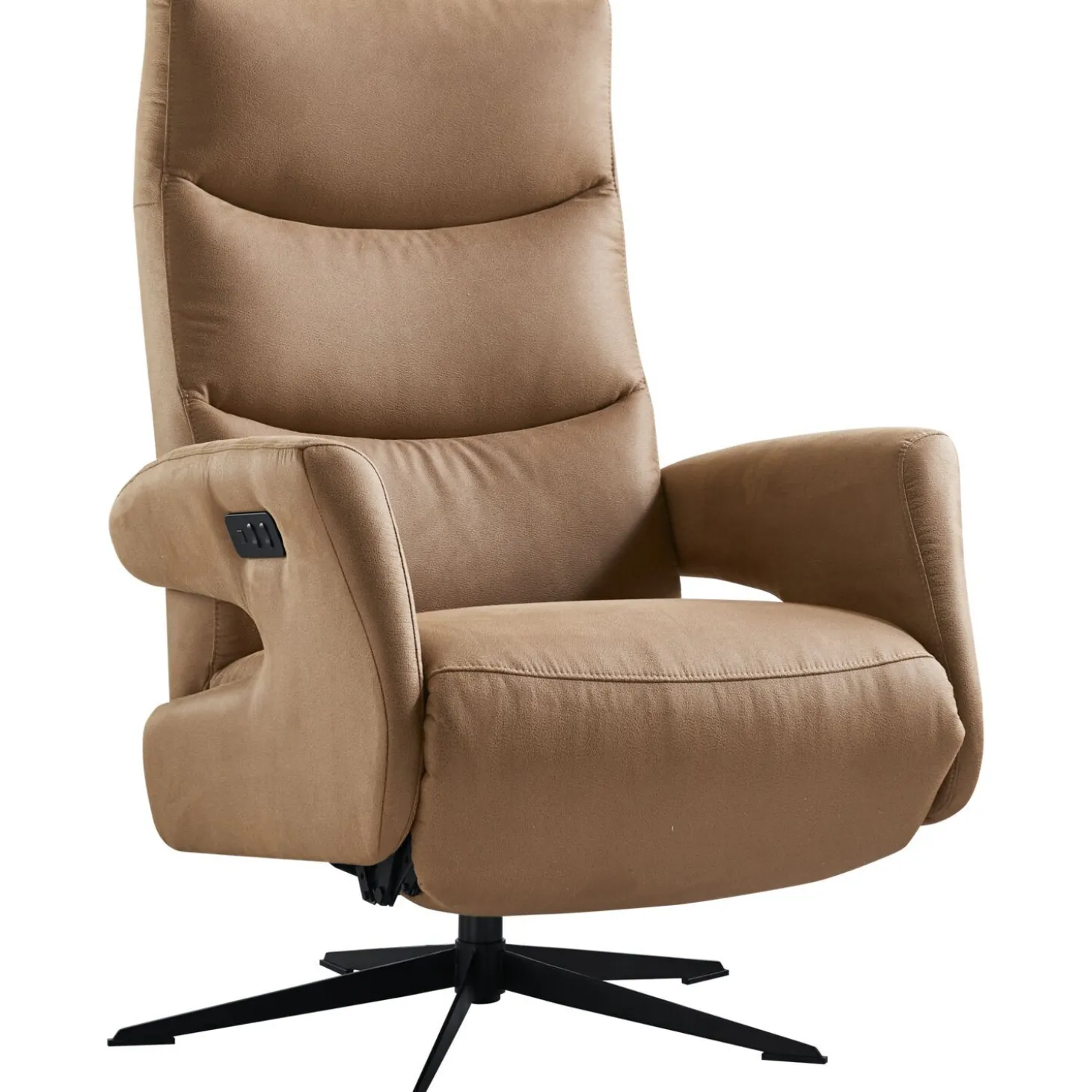 | Uitvoering | Uitgevoerd in stof ranch 2787-cognac met verstelbare rugleuning en voetensteun d.m.v. 2-motoren en mat zwarte 5-teensvoet (voet orion, model OSS). |