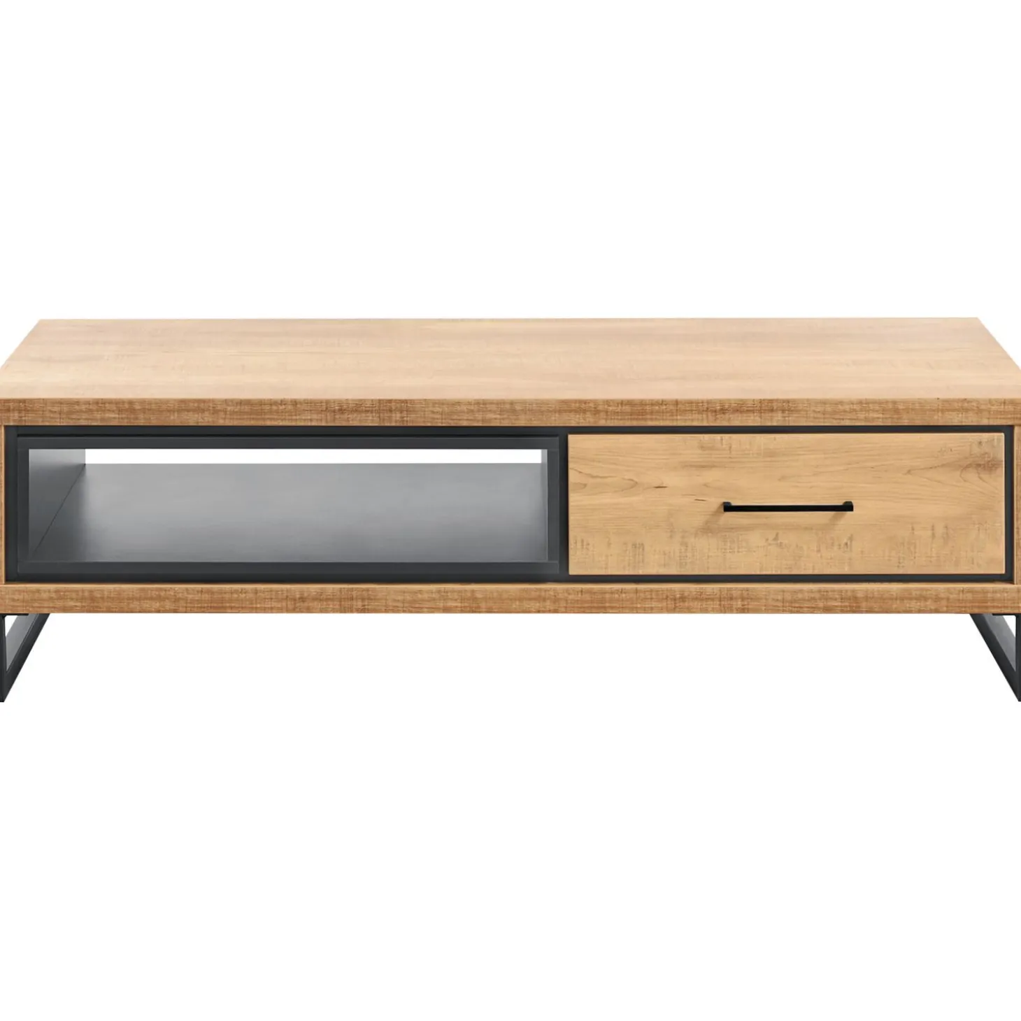 De salontafel is voorzien van een ruim tafelblad met extra opbergruimte in de lade, ideaal voor magazines of afstandsbedieningen. Het moderne mango decor, gecombineerd met het zwarte metalen frame, geeft de tafel een stoere en eigentijdse uitstraling.