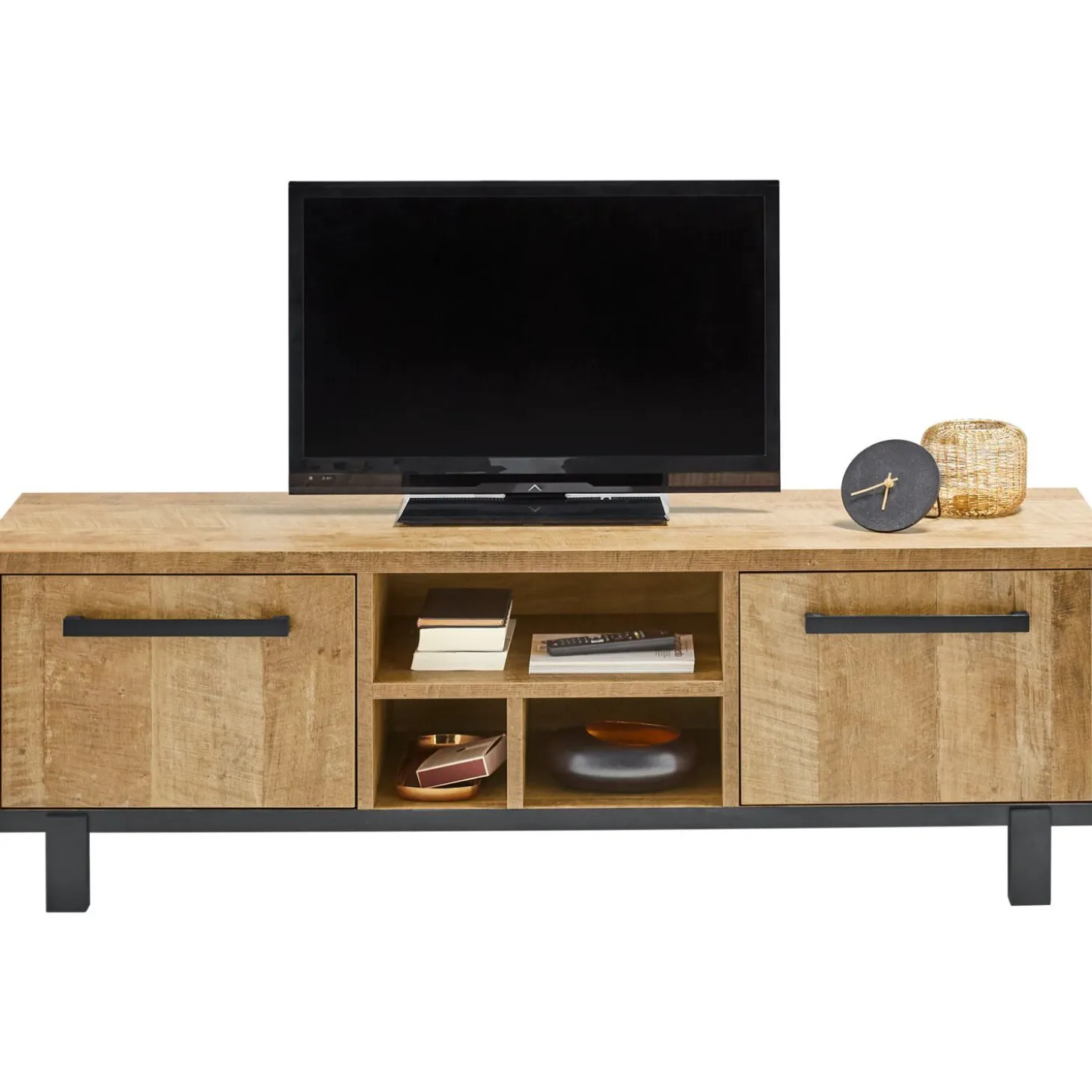 Modern tv-meubel met een strak uiterlijk. De mooie kleur old teak en het gepoedercoate zwart metalen frame geven je interieur een unieke sfeer.