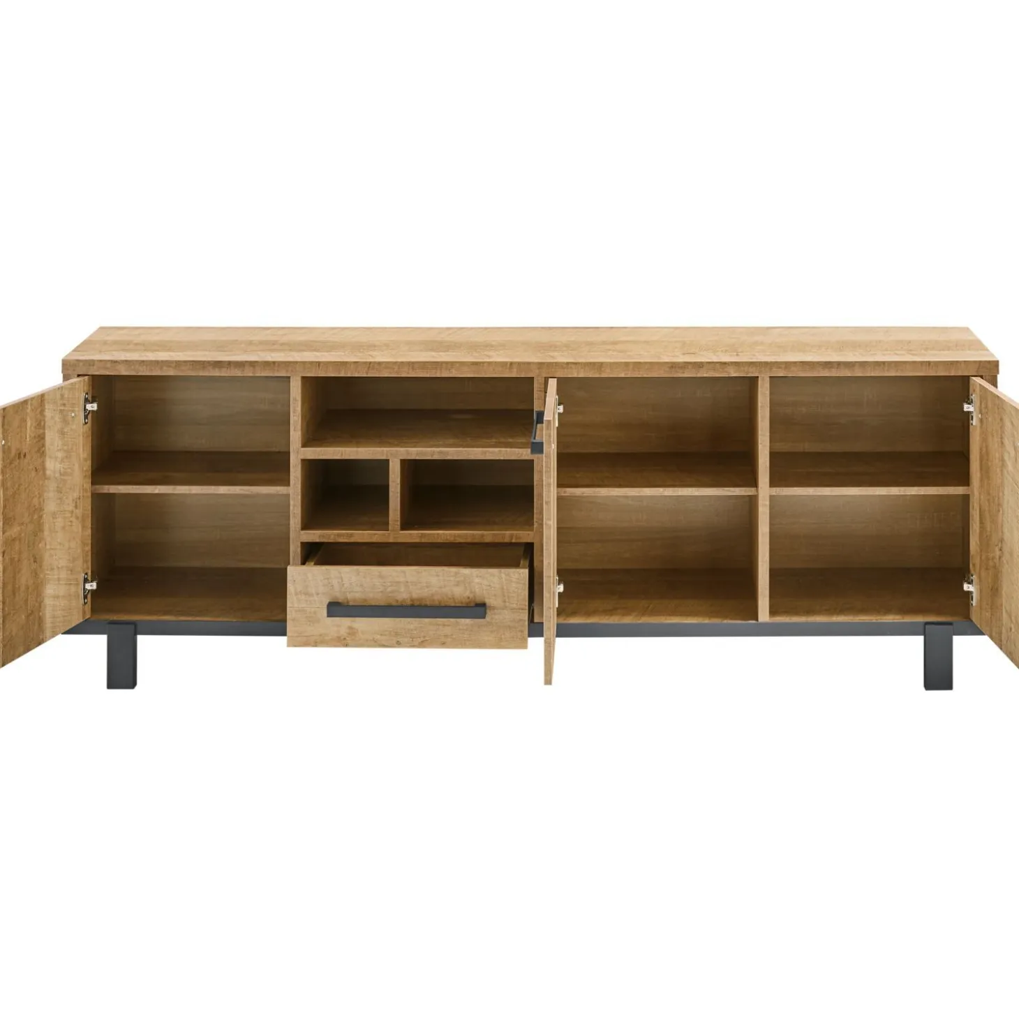 | Uitvoering | Uitgevoerd in de kleur old teak met zwart metalen frame, 3 deuren, 1 lade en 3 open vakken. |