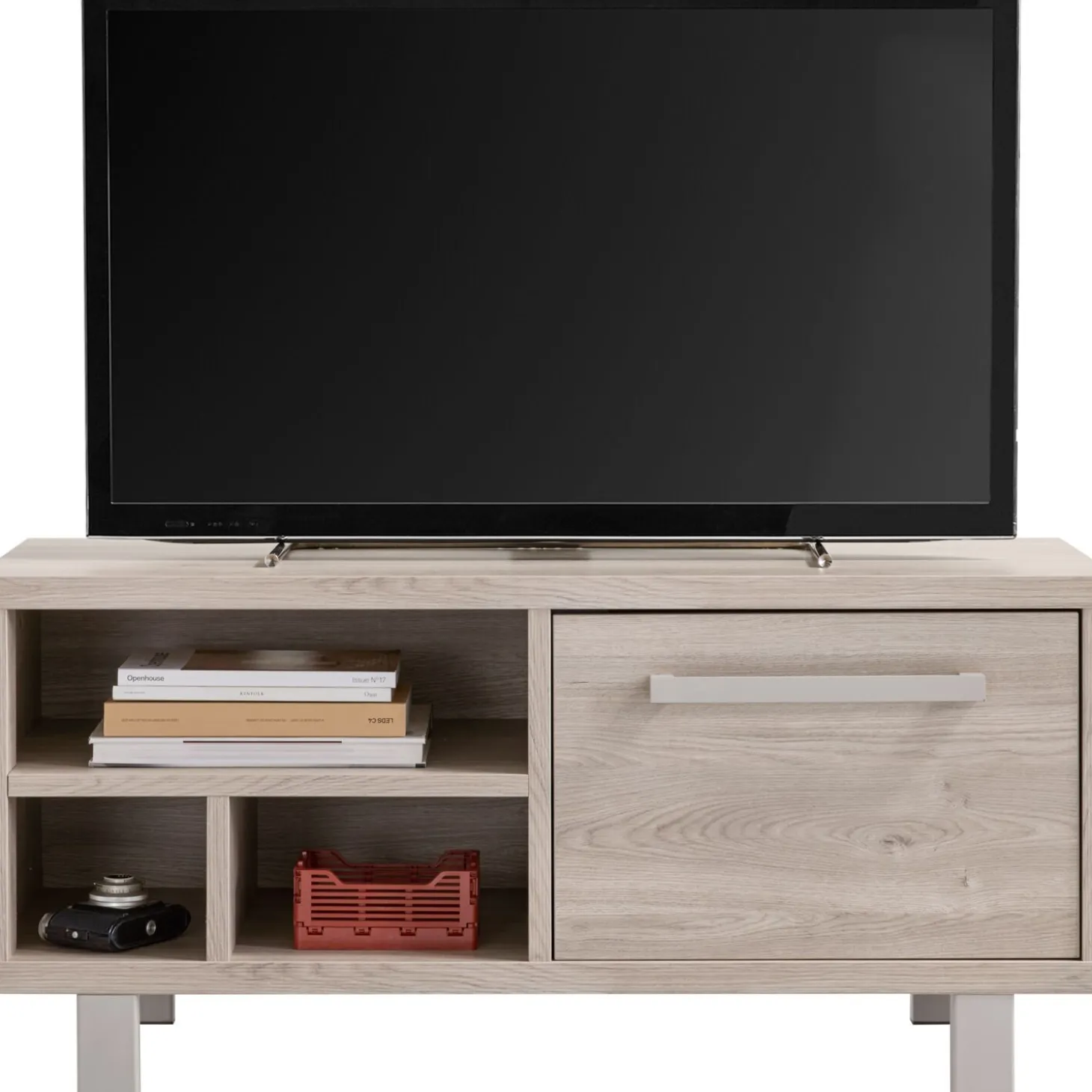 Modern TV-meubel met een strak uiterlijk. De mooie kleur grey oak en het gepoedercoate lichtgrijze metalen frame geven je interieur een unieke, zachte sfeer.