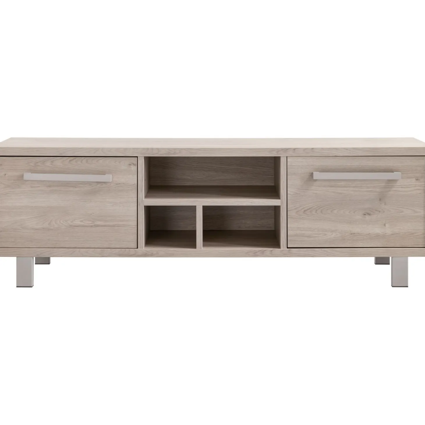| Uitvoering | Uitgevoerd in de kleur grey oak met metalen handgrepen en poten in de kleur stone grey, met 2 deuren en 3 open vakken. |